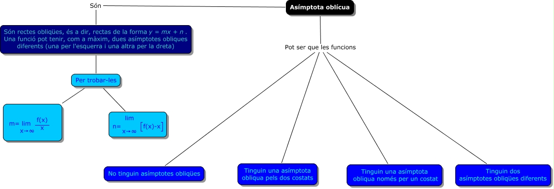 </mtext> </mrow> </math>, Asímptota oblícua Pot ser que les funcions Tinguin una asímptota obliqua pels dos costats, Són rectes obliqües, és a dir, rectas de la forma y = mx + n. Una funció pot tenir, com a màxim, dues asímptotes obliques diferents (una per l'esquerra i una altra per la dreta) Per trobar-les, Per trobar-les <math xmlns="http://www.w3.org/1998/Math/MathML"> <mrow> <mtext> n= </mtext> <mtable> <mtr> <mtd> <mtext> lim </mtext> </mtd> </mtr> <mtr> <mtd> <mtext> x→∞ </mtext> </mtd> </mtr> </mtable> <mtext> </mtext> <mfenced open="[" close="]"> <mtext> f(x)-x </mtext> </mfenced> </mrow> </math>, Asímptota oblícua Són Són rectes obliqües, és a dir, rectas de la forma y = mx + n. Una funció pot tenir, com a màxim, dues asímptotes obliques diferents (una per l'esquerra i una altra per la dreta)