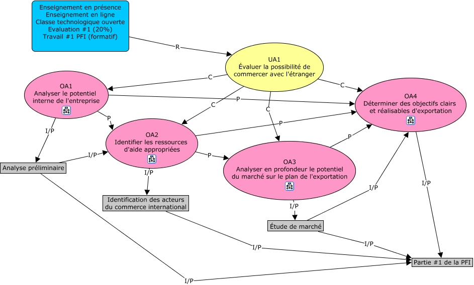 Cette carte de concepts créée avec IHMC CmapTools traite de: UA1, OA3 Analyser en profondeur le potentiel du marché sur le plan de l'exportation I/P Étude de marché, OA2 Identifier les ressources d'aide appropriées I/P Identification des acteurs du commerce international, Étude de marché I/P OA4 Déterminer des objectifs clairs et réalisables d'exportation, OA1 Analyser le potentiel interne de l'entreprise P OA4 Déterminer des objectifs clairs et réalisables d'exportation, Enseignement en présence Enseignement en ligne Classe technologique ouverte Evaluation #1 (20%) Travail #1 PFI (formatif) R UA1 Évaluer la possibilité de commercer avec l'étranger, UA1 Évaluer la possibilité de commercer avec l'étranger C OA2 Identifier les ressources d'aide appropriées, Analyse préliminaire I/P Partie #1 de la PFI, UA1 Évaluer la possibilité de commercer avec l'étranger C OA1 Analyser le potentiel interne de l'entreprise, Identification des acteurs du commerce international I/P Partie #1 de la PFI, OA4 Déterminer des objectifs clairs et réalisables d'exportation I/P Partie #1 de la PFI, OA1 Analyser le potentiel interne de l'entreprise I/P Analyse préliminaire, UA1 Évaluer la possibilité de commercer avec l'étranger C OA4 Déterminer des objectifs clairs et réalisables d'exportation, OA2 Identifier les ressources d'aide appropriées P OA4 Déterminer des objectifs clairs et réalisables d'exportation, Étude de marché I/P Partie #1 de la PFI, OA1 Analyser le potentiel interne de l'entreprise P OA2 Identifier les ressources d'aide appropriées, OA2 Identifier les ressources d'aide appropriées P OA3 Analyser en profondeur le potentiel du marché sur le plan de l'exportation, Analyse préliminaire I/P OA2 Identifier les ressources d'aide appropriées, UA1 Évaluer la possibilité de commercer avec l'étranger C OA3 Analyser en profondeur le potentiel du marché sur le plan de l'exportation, OA3 Analyser en profondeur le potentiel du marché sur le plan de l'exportation P OA4 Déterminer des objectifs clairs et réalisables d'exportation