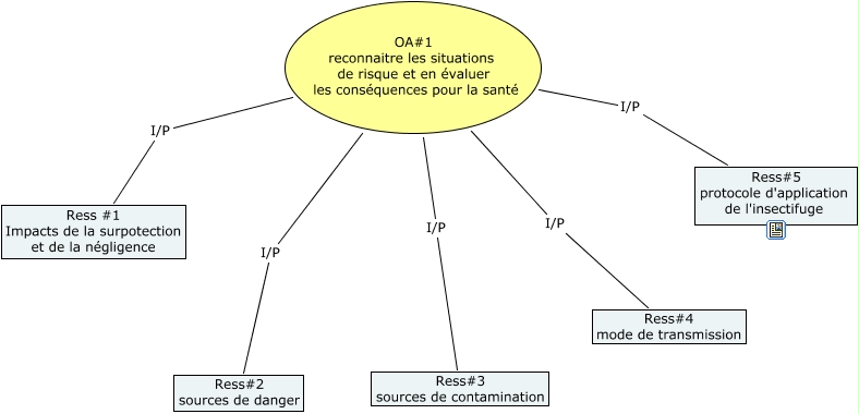 Cette carte de concepts créée avec IHMC CmapTools traite de: OA1, OA#1 reconnaitre les situations de risque et en évaluer les conséquences pour la santé I/P Ress#3 sources de contamination, OA#1 reconnaitre les situations de risque et en évaluer les conséquences pour la santé I/P Ress#4 mode de transmission, OA#1 reconnaitre les situations de risque et en évaluer les conséquences pour la santé I/P Ress#2 sources de danger, OA#1 reconnaitre les situations de risque et en évaluer les conséquences pour la santé I/P Ress#5 protocole d'application de l'insectifuge, OA#1 reconnaitre les situations de risque et en évaluer les conséquences pour la santé I/P Ress #1 Impacts de la surpotection et de la négligence