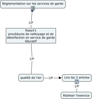 Cette carte de concepts créée avec IHMC CmapTools traite de: Ress, qualité de l'air I/P Lire les 2 articles, Lire les 2 articles I/P Réaliser l'exercice, Ress#1 procédures de nettoyage et de désinfection en service de garde éducatif I/P Règlementation sur les services de garde, Ress#1 procédures de nettoyage et de désinfection en service de garde éducatif I/P qualité de l'air