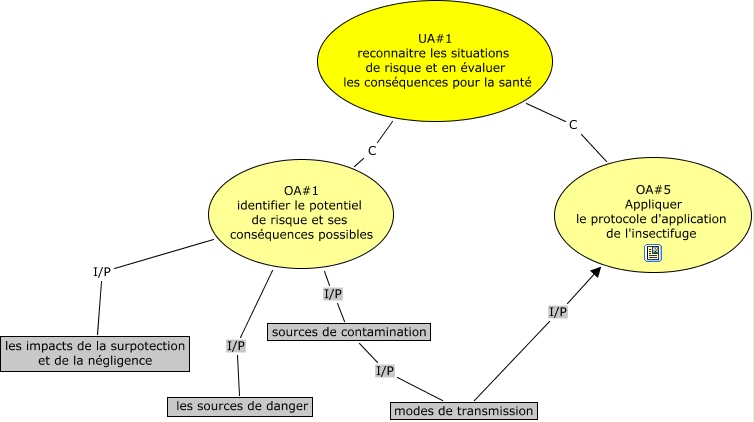 Cette carte de concepts créée avec IHMC CmapTools traite de: OA1, UA#1 reconnaitre les situations de risque et en évaluer les conséquences pour la santé C OA#1 identifier le potentiel de risque et ses conséquences possibles, OA#1 identifier le potentiel de risque et ses conséquences possibles I/P les impacts de la surpotection et de la négligence, UA#1 reconnaitre les situations de risque et en évaluer les conséquences pour la santé C OA#5 Appliquer le protocole d'application de l'insectifuge, sources de contamination I/P modes de transmission, modes de transmission I/P OA#5 Appliquer le protocole d'application de l'insectifuge, OA#1 identifier le potentiel de risque et ses conséquences possibles I/P les sources de danger, OA#1 identifier le potentiel de risque et ses conséquences possibles I/P sources de contamination