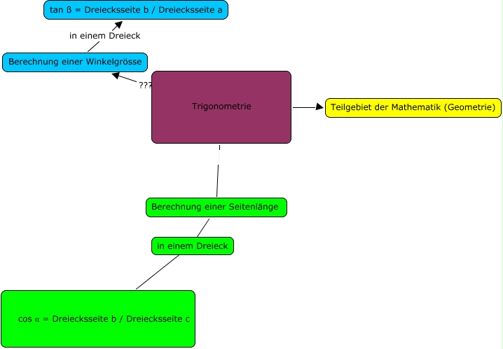 This Concept Map, created with IHMC CmapTools, has information related to: Untitled 1, Trigonometrie Berechnung einer Seitenlänge, Trigonometrie ???? Berechnung einer Winkelgrösse, Berechnung einer Winkelgrösse in einem Dreieck tan ß = Dreiecksseite b / Dreiecksseite a, Trigonometrie Teilgebiet der Mathematik (Geometrie), Berechnung einer Seitenlänge ___ cos α = Dreiecksseite b / Dreiecksseite c
