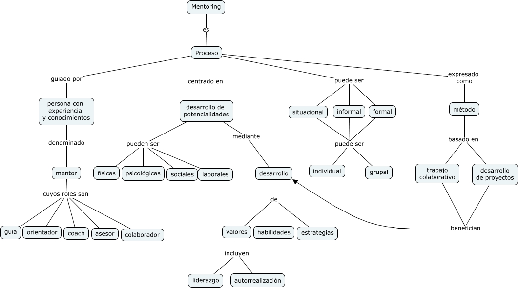 This Concept Map, created with IHMC CmapTools, has information related to: Mentoring, valores incluyen liderazgo, situacional puede ser individual, formal puede ser individual, mentor cuyos roles son guia, desarrollo de habilidades, Proceso puede ser formal, método basado en desarrollo de proyectos, formal puede ser grupal, método basado en trabajo colaborativo, informal puede ser individual, Proceso puede ser situacional, persona con experiencia y conocimientos denominado mentor, informal puede ser grupal, mentor cuyos roles son orientador, desarrollo de proyectos benefician desarrollo, desarrollo de potencialidades pueden ser físicas, Proceso puede ser informal, Proceso centrado en desarrollo de potencialidades, desarrollo de potencialidades pueden ser psicológicas, mentor cuyos roles son asesor