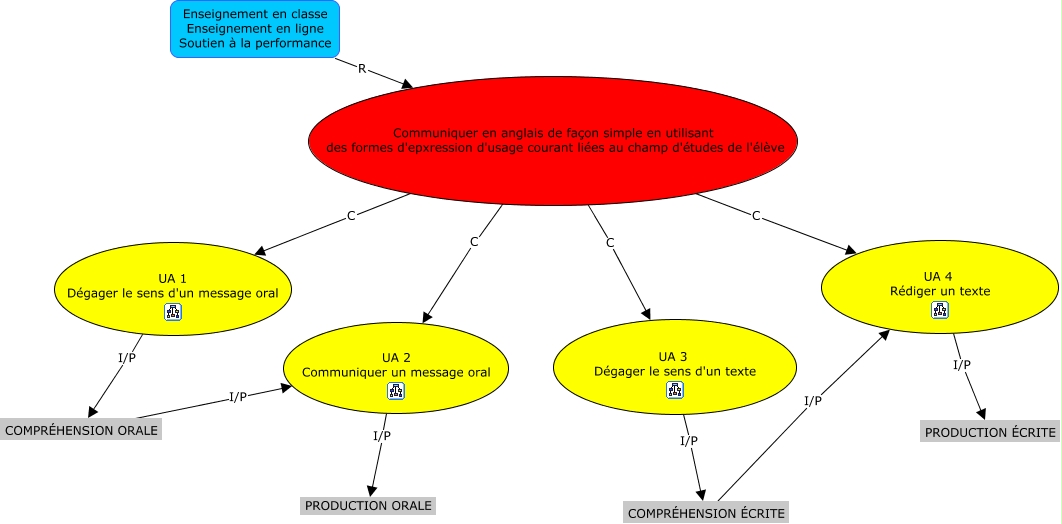 Cette carte de concepts créée avec IHMC CmapTools traite de: SA_AJE, UA 2 Communiquer un message oral I/P PRODUCTION ORALE, Communiquer en anglais de façon simple en utilisant des formes d'epxression d'usage courant liées au champ d'études de l'élève C UA 4 Rédiger un texte, Enseignement en classe Enseignement en ligne Soutien à la performance R Communiquer en anglais de façon simple en utilisant des formes d'epxression d'usage courant liées au champ d'études de l'élève, UA 4 Rédiger un texte I/P PRODUCTION ÉCRITE, COMPRÉHENSION ORALE I/P UA 2 Communiquer un message oral, Communiquer en anglais de façon simple en utilisant des formes d'epxression d'usage courant liées au champ d'études de l'élève C UA 1 Dégager le sens d'un message oral, UA 3 Dégager le sens d'un texte I/P COMPRÉHENSION ÉCRITE, UA 1 Dégager le sens d'un message oral I/P COMPRÉHENSION ORALE, COMPRÉHENSION ÉCRITE I/P UA 4 Rédiger un texte, Communiquer en anglais de façon simple en utilisant des formes d'epxression d'usage courant liées au champ d'études de l'élève C UA 2 Communiquer un message oral, Communiquer en anglais de façon simple en utilisant des formes d'epxression d'usage courant liées au champ d'études de l'élève C UA 3 Dégager le sens d'un texte