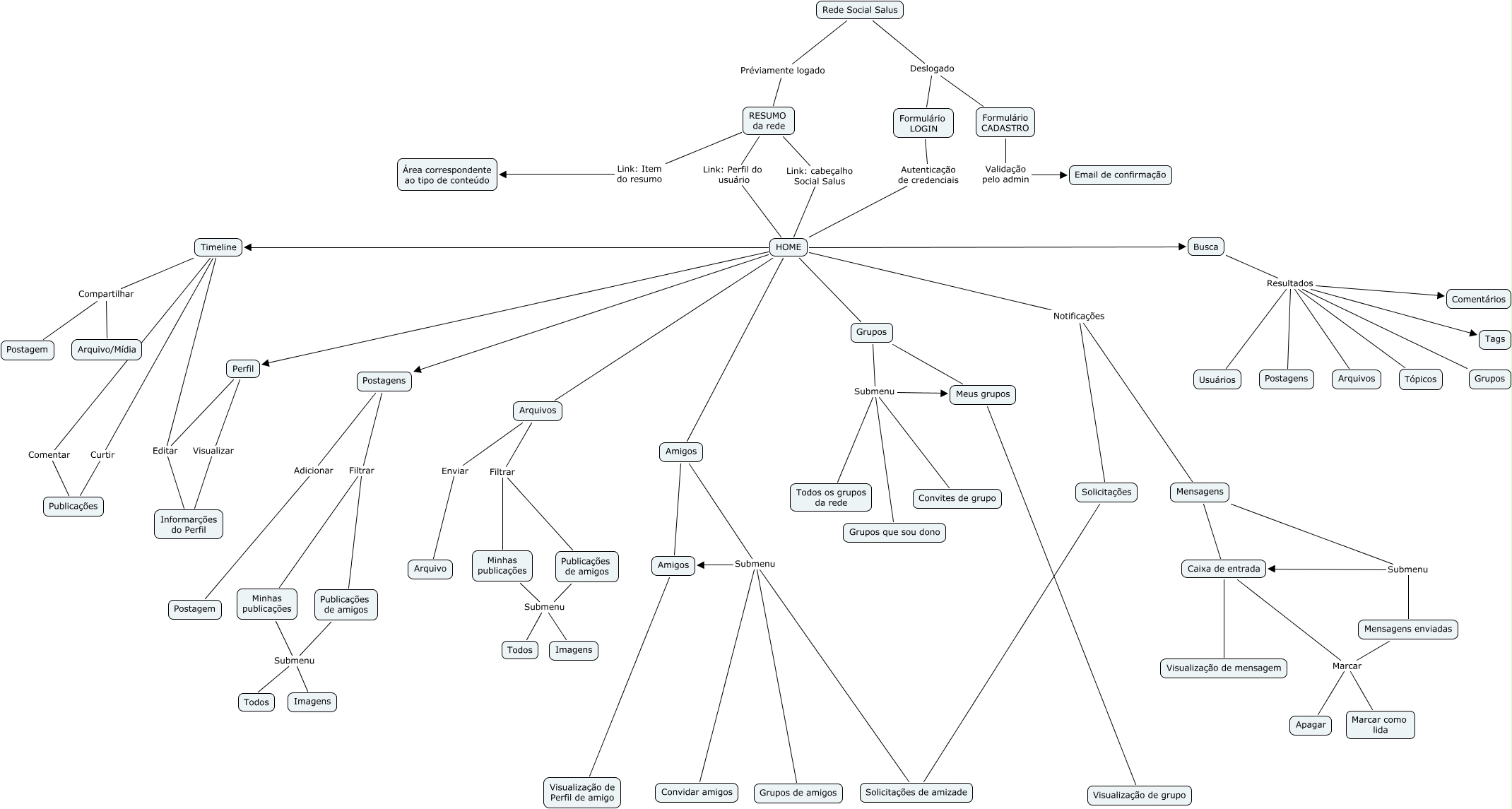 Esse mapa conceitual, produzido no IHMC CmapTools, tem a informação relacionada a: Social-Salus, HOME Timeline, Busca Resultados Arquivos, Rede Social Salus Deslogado Formulário CADASTRO, Minhas publicações Submenu Todos, HOME Perfil, HOME Notificações Solicitações, Amigos Submenu Convidar amigos, Postagens Filtrar Minhas publicações, Arquivos Enviar Arquivo, Grupos Submenu Meus grupos, Grupos Submenu Convites de grupo, Postagens Filtrar Publicações de amigos, HOME Busca, Mensagens Caixa de entrada, HOME Notificações Mensagens, Minhas publicações Submenu Todos, Caixa de entrada Marcar Marcar como lida, Caixa de entrada Marcar Apagar, Caixa de entrada Visualização de mensagem, Amigos Visualização de Perfil de amigo