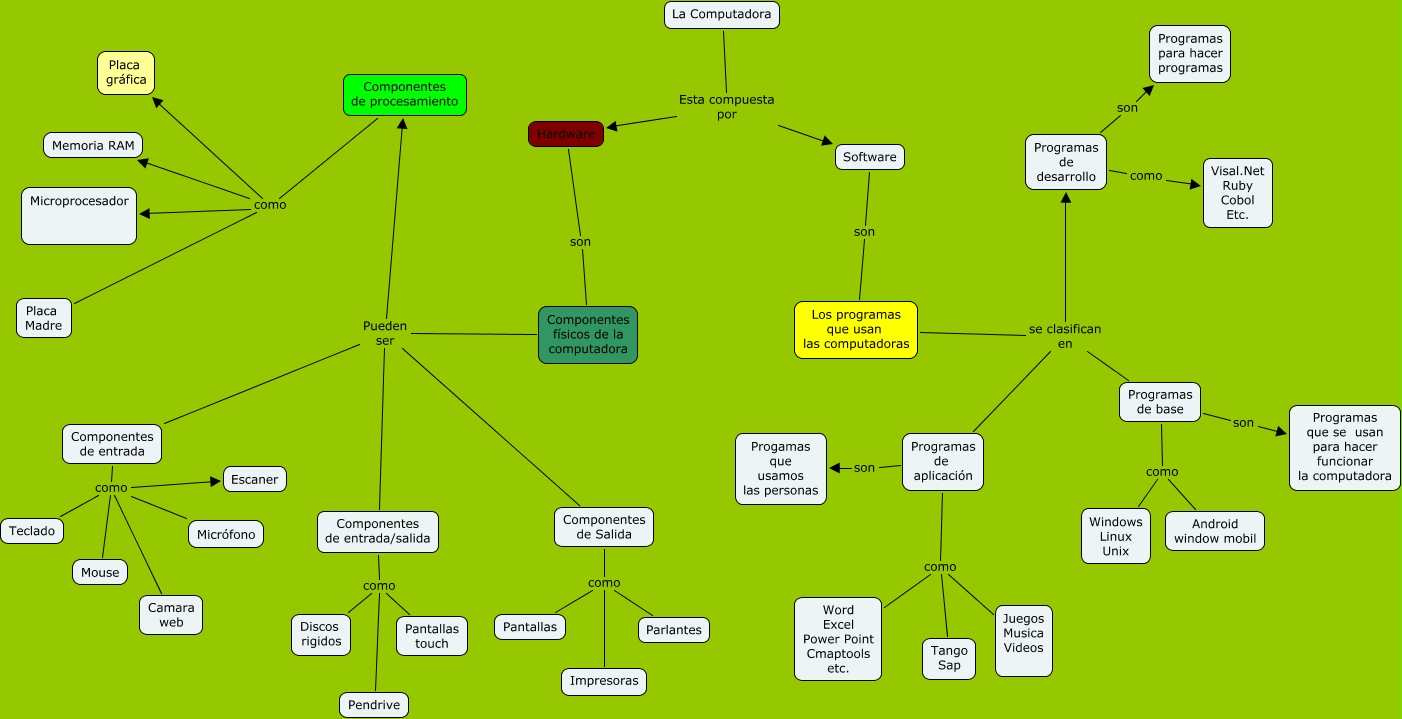Este Cmap, tiene información relacionada con: computadora, Programas de desarrollo son Programas para hacer programas, Componentes físicos de la computadora Pueden ser Componentes de entrada, Componentes de entrada como Camara web, Componentes de entrada como Teclado, Programas de aplicación son Progamas que usamos las personas, Programas de desarrollo como Visal.Net Ruby Cobol Etc., Componentes de Salida como Impresoras, Programas de aplicación como Tango Sap, Programas de base son Programas que se usan para hacer funcionar la computadora, Componentes físicos de la computadora Pueden ser Componentes de Salida, La Computadora Esta compuesta por Software, Hardware son Componentes físicos de la computadora, Componentes de entrada/salida como Pendrive, Programas de base como Android window mobil, Software son Los programas que usan las computadoras, Componentes de procesamiento como Memoria RAM, Los programas que usan las computadoras se clasifican en Programas de base, Programas de base como Windows Linux Unix, Componentes de Salida como Pantallas, Componentes de entrada como Escaner