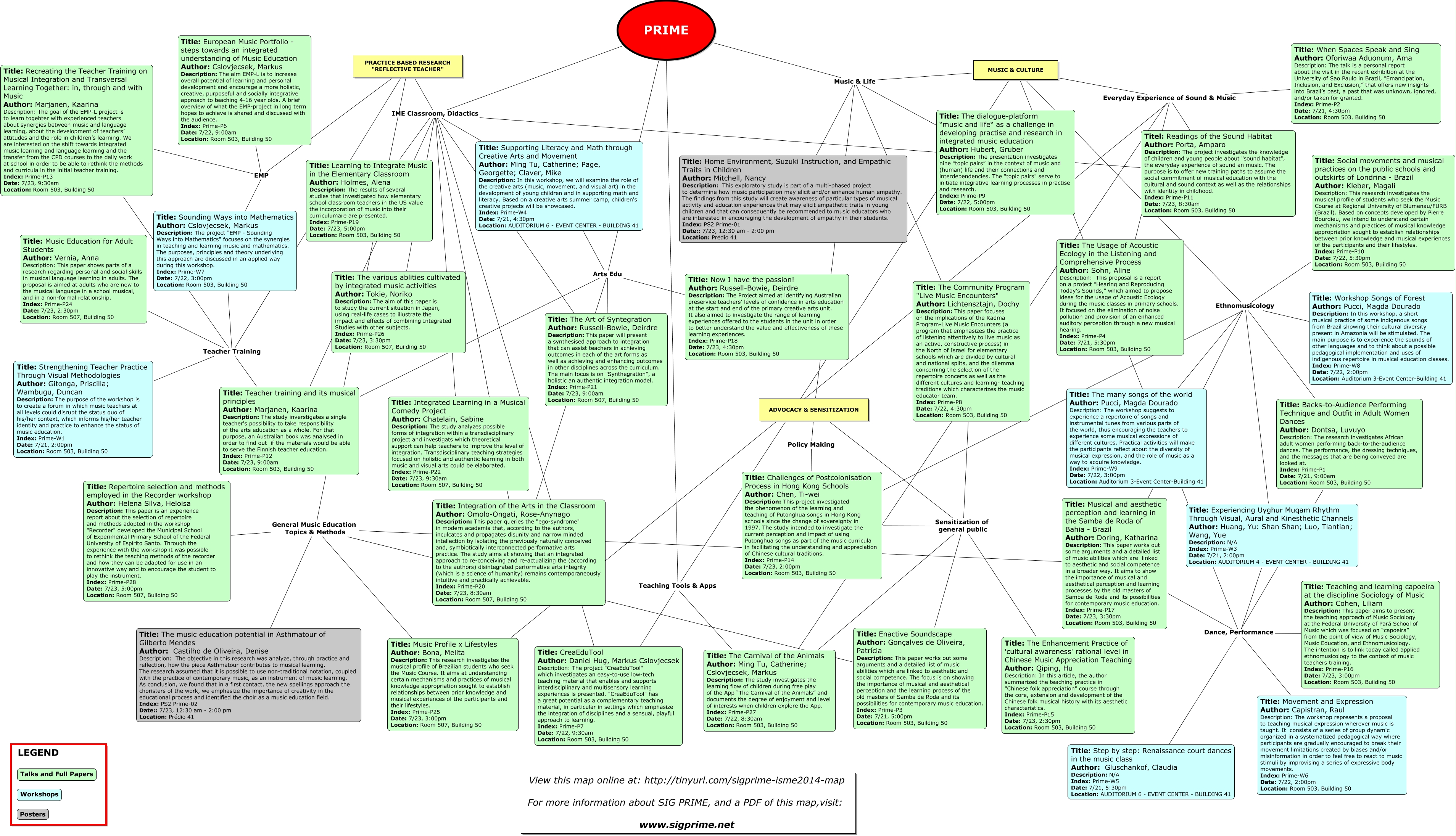 Dieses mit IHMC CmapTools erstellte CMap hat Informationen bezüglich: ISME2014_prime_sessions_overview.cmap, Title: The various ablities cultivated by integrated music activities Author: Tokie, Noriko Description: The aim of this paper is to study the current situation in Japan, using real-life cases to illustrate the impact and effects of combining Integrated Studies with other subjects. Index: Prime-P26 Date: 7/23, 3:30pm Location: Room 507, Building 50 IME Classroom, Didactics Title: Integration of the Arts in the Classroom Author: Omolo-Ongati, Rose-Anynago Description: This paper queries the "ego-syndrome" in modern academia that, according to the authors, inculcates and propagates disunity and narrow minded intellection by isolating the previously naturally conceived and, symbiotically interconnected performative arts practice. The study aims at showing that an integrated approach to re-conceiving and re-actualizing the (according to the authors) disintegrated performative arts integrity (which is a science of humanity) remains contemporaneously intuitive and practically achievable. Index: Prime-P20 Date: 7/23, 8:30am Location: Room 507, Building 50, Title: Learning to Integrate Music in the Elementary Classroom Author: Holmes, Alena Description: The results of several studies that investigated how elementary school classroom teachers in the US value the incorporation of music into their curriculumare are presented. Index: Prime-P19 Date: 7/23, 5:00pm Location: Room 503, Building 50 IME Classroom, Didactics PRACTICE BASED RESEARCH "REFLECTIVE TEACHER", Titel: Readings of the Sound Habitat Author: Porta, Amparo Description: The project investigates the knowledge of children and young people about "sound habitat", the everyday experience of sound an music. The purpose is to offer new training paths to assume the social commitment of musical education with the cultural and sound context as well as the relationships with identity in childhood. Index: Prime-P11 Date: 7/23, 8:30am Location: Room 503, Building 50 IME Classroom, Didactics Title: Integration of the Arts in the Classroom Author: Omolo-Ongati, Rose-Anynago Description: This paper queries the "ego-syndrome" in modern academia that, according to the authors, inculcates and propagates disunity and narrow minded intellection by isolating the previously naturally conceived and, symbiotically interconnected performative arts practice. The study aims at showing that an integrated approach to re-conceiving and re-actualizing the (according to the authors) disintegrated performative arts integrity (which is a science of humanity) remains contemporaneously intuitive and practically achievable. Index: Prime-P20 Date: 7/23, 8:30am Location: Room 507, Building 50, Title: The Art of Syntegration Author: Russell-Bowie, Deirdre Description: This paper will present a synthesised approach to integration that can assist teachers in achieving outcomes in each of the art forms as well as achieving and enhancing outcomes in other disciplines across the curriculum. The main focus is on "Synthegration", a holistic an authentic integration model. Index: Prime-P21 Date: 7/23, 9:00am Location: Room 507, Building 50 Arts Edu PRIME, Title: Teacher training and its musical principles Author: Marjanen, Kaarina Description: The study inverstigates a single teacher's possibility to take responsibility of the arts education as a whole. For that purpose, an Australian book was analysed in order to find out if the materials would be able to serve the Finnish teacher education. Index: Prime-P12 Date: 7/23, 9:00am Location: Room 503, Building 50 IME Classroom, Didactics PRACTICE BASED RESEARCH "REFLECTIVE TEACHER", Title: The various ablities cultivated by integrated music activities Author: Tokie, Noriko Description: The aim of this paper is to study the current situation in Japan, using real-life cases to illustrate the impact and effects of combining Integrated Studies with other subjects. Index: Prime-P26 Date: 7/23, 3:30pm Location: Room 507, Building 50 IME Classroom, Didactics PRACTICE BASED RESEARCH "REFLECTIVE TEACHER", PRIME Music & Life ADVOCACY & SENSITIZATION, Title: Enactive Soundscape Author: Gonçalves de Oliveira, Patrícia Description: This paper works out some arguments and a detailed list of music abilities which are linked to aesthetic and social competence. The focus is on showing the importance of musical and aesthetical perception and the learning process of the old masters of Samba de Roda and its possibilities for contemporary music education. Index: Prime-P3 Date: 7/21, 5:00pm Location: Room 503, Building 50 Sensitization of general public Title: Challenges of Postcolonisation Process in Hong Kong Schools Author: Chen, Ti-wei Description: This project investigated the phenomenon of the learning and teaching of Putonghua songs in Hong Kong schools since the change of sovereignty in 1997. The study intended to investigate the current perception and impact of using Putonghua songs as part of the music curricula in facilitating the understanding and appreciation of Chinese cultural traditions. Index: Prime-P14 Date: 7/23, 2:00pm Location: Room 503, Building 50, PRIME IME Classroom, Didactics Title: Integration of the Arts in the Classroom Author: Omolo-Ongati, Rose-Anynago Description: This paper queries the "ego-syndrome" in modern academia that, according to the authors, inculcates and propagates disunity and narrow minded intellection by isolating the previously naturally conceived and, symbiotically interconnected performative arts practice. The study aims at showing that an integrated approach to re-conceiving and re-actualizing the (according to the authors) disintegrated performative arts integrity (which is a science of humanity) remains contemporaneously intuitive and practically achievable. Index: Prime-P20 Date: 7/23, 8:30am Location: Room 507, Building 50, Title: Challenges of Postcolonisation Process in Hong Kong Schools Autho