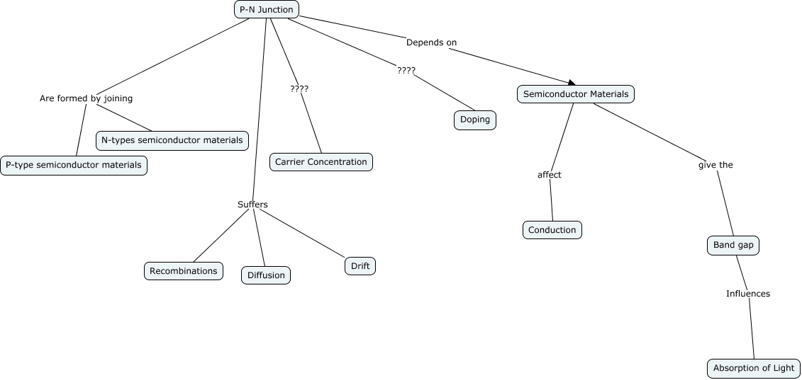 This Concept Map, created with IHMC CmapTools, has information related to: prostie1, Semiconductor Materials affect Conduction, P-N Junction Depends on Semiconductor Materials, P-N Junction Are formed by joining N-types semiconductor materials, P-N Junction Suffers Diffusion, P-N Junction ???? Carrier Concentration, Band gap Influences Absorption of Light, P-N Junction Suffers Recombinations, P-N Junction Are formed by joining P-type semiconductor materials, P-N Junction Suffers Drift, P-N Junction ???? Doping, Semiconductor Materials give the Band gap