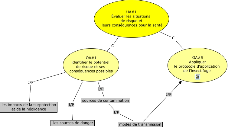 Cette carte de concepts créée avec IHMC CmapTools traite de: OA1, OA#1 identifier le potentiel de risque et ses conséquences possibles I/P les impacts de la surpotection et de la négligence, UA#1 Évaluer les situations de risque et leurs conséquences pour la santé C OA#1 identifier le potentiel de risque et ses conséquences possibles, sources de contamination I/P modes de transmission, UA#1 Évaluer les situations de risque et leurs conséquences pour la santé C OA#5 Appliquer le protocole d'application de l'insectifuge, modes de transmission I/P OA#5 Appliquer le protocole d'application de l'insectifuge, OA#1 identifier le potentiel de risque et ses conséquences possibles I/P sources de contamination, OA#1 identifier le potentiel de risque et ses conséquences possibles I/P les sources de danger