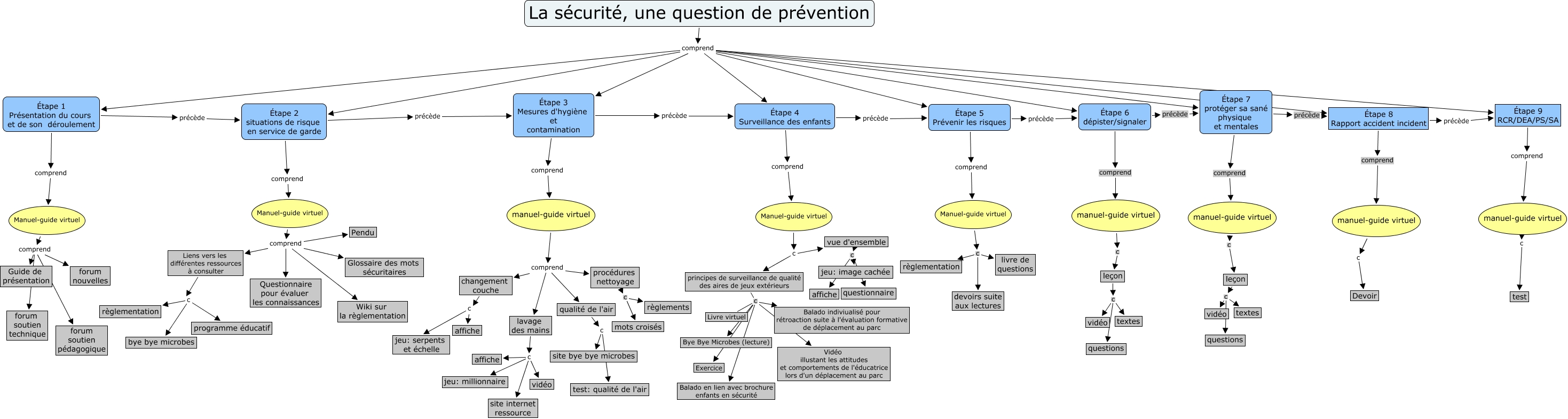 Cette carte de concepts créée avec IHMC CmapTools traite de: schéma déroulement activité JCroteau, principes de surveillance de qualité des aires de jeux extérieurs c Balado indiviualisé pour rétroaction suite à l'évaluation formative de déplacement au parc, Étape 1 Présentation du cours et de son déroulement comprend Manuel-guide virtuel, Étape 2 situations de risque en service de garde comprend Manuel-guide virtuel, Manuel-guide virtuel comprend Pendu, Manuel-guide virtuel c vue d'ensemble, leçon c questions, leçon c textes, La sécurité, une question de prévention comprend Étape 2 situations de risque en service de garde, qualité de l'air c site bye bye microbes, Étape 5 Prévenir les risques comprend Manuel-guide virtuel, leçon c vidéo, manuel-guide virtuel c leçon, Manuel-guide virtuel comprend forum soutien technique, Étape 5 Prévenir les risques précède Étape 6 dépister/signaler, Manuel-guide virtuel comprend Guide de présentation, Étape 6 dépister/signaler précède Étape 7 protéger sa sané physique et mentales, Étape 1 Présentation du cours et de son déroulement précède Étape 2 situations de risque en service de garde, Liens vers les différentes ressources à consulter c programme éducatif, Étape 6 dépister/signaler comprend manuel-guide virtuel, La sécurité, une question de prévention comprend Étape 6 dépister/signaler