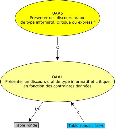 Cette carte de concepts créée avec IHMC CmapTools traite de: UA5, Table ronde : 10% R OA#1 Présenter un discours oral de type informatif et critique en fonction des contraintes données, OA#1 Présenter un discours oral de type informatif et critique en fonction des contraintes données I/P Table ronde, UA#5 Présenter des discours oraux de type informatif, critique ou expressif C OA#1 Présenter un discours oral de type informatif et critique en fonction des contraintes données