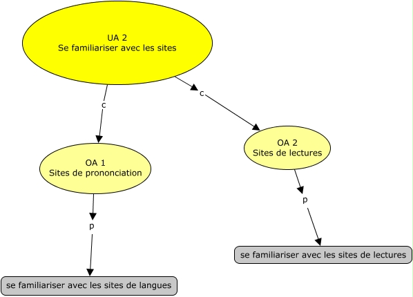 This Concept Map, created with IHMC CmapTools, has information related to: OA 2, UA 2 Se familiariser avec les sites c OA 2 Sites de lectures, OA 1 Sites de prononciation p se familiariser avec les sites de langues, UA 2 Se familiariser avec les sites c OA 1 Sites de prononciation, OA 2 Sites de lectures p se familiariser avec les sites de lectures