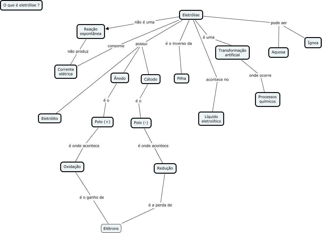 Esse mapa conceitual, produzido no IHMC CmapTools, tem a informação relacionada a: gibaaaaaaaaaaaaaaaaaaaaaaaaaaaaaaaaaaaaaaaaaaaaaaaaaaaaaaaaaaaaaaaaaaaaaaaaa, Ânodo é o Polo (+), Eletrólise consome Corrente elétrica, Eletrólise não é uma Reação espontânea, Redução é a perda de Elétrons, Transformação artificial onde ocorre Processos químicos, Eletrólise possui Ânodo, Eletrólise é o inverso da Pilha, Eletrólise pode ser �?gnea, Eletrólise é uma Transformação artificial, Reação espontânea não produz Corrente elétrica, Oxidação é o ganho de Elétrons, Eletrólise acontece no Líquido eletrolítico, Polo (+) é onde acontece Oxidação, Eletrólise possui Cátodo, Polo (-) é onde acontece Redução, Cátodo é o Polo (-), Aquosa pode ser �?gnea, Eletrólise possui Eletrólito