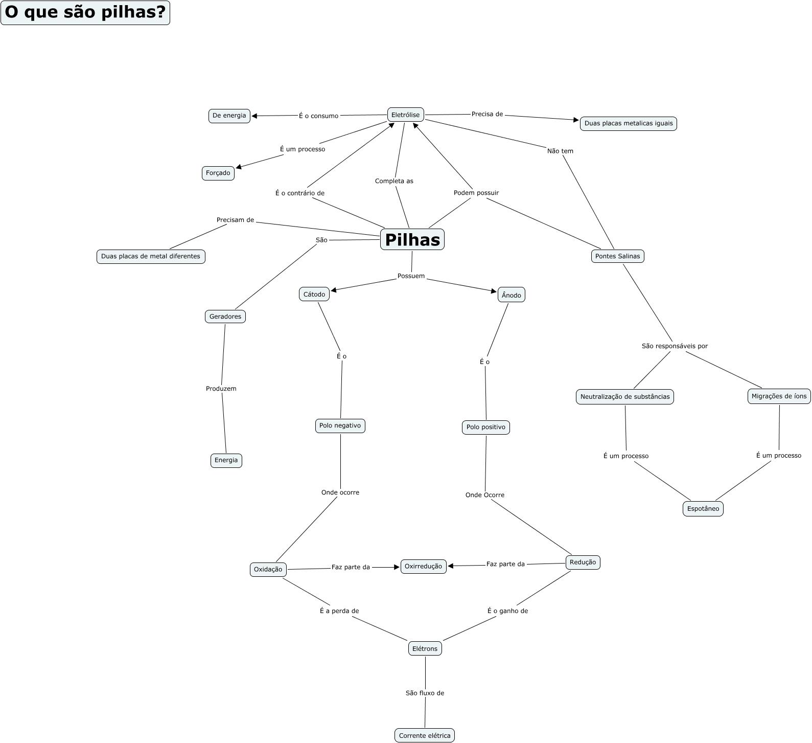 Esse mapa conceitual, produzido no IHMC CmapTools, tem a informação relacionada a: Larissa V. e Thais, Migrações de íons É um processo Espotâneo, Pilhas Podem possuir Pontes Salinas, Oxidação É a perda de Elétrons, Redução Faz parte da Oxirredução, Eletrólise É um processo Forçado, Pilhas Possuem Cátodo, Pilhas São Geradores, Elétrons São fluxo de Corrente elétrica, Polo negativo Onde ocorre Oxidação, Eletrólise Completa as Pilhas, Pilhas Podem possuir Eletrólise, Geradores Produzem Energia, Ânodo É o Polo positivo, Pontes Salinas São responsáveis por Neutralização de substâncias, Eletrólise Precisa de Duas placas metalicas iguais, Pilhas Precisam de Duas placas de metal diferentes, Neutralização de substâncias É um processo Espotâneo, Pilhas Possuem Ânodo, Pilhas É o contrário de Eletrólise, Eletrólise Não tem Pontes Salinas
