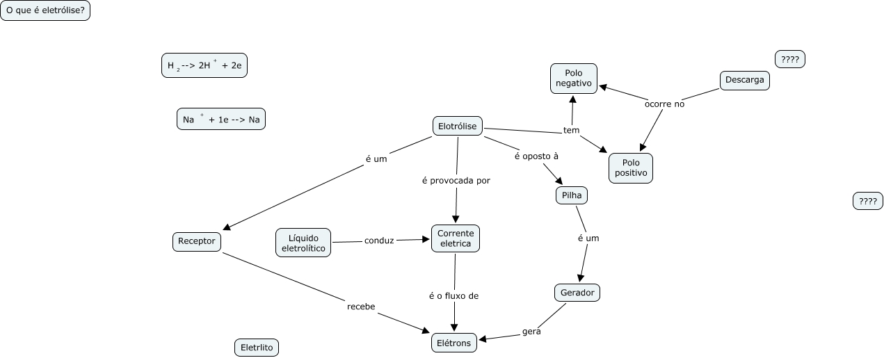 Esse mapa conceitual, produzido no IHMC CmapTools, tem a informação relacionada a: vianna gatinho, Elotrólise é oposto à Pilha, Elotrólise é um Receptor, Receptor recebe Elétrons, Elotrólise é provocada por Corrente eletrica, Pilha é um Gerador, Elotrólise tem Polo negativo, Descarga ocorre no Polo positivo, Elotrólise tem Polo positivo, Líquido eletrolítico conduz Corrente eletrica, Corrente eletrica é o fluxo de Elétrons, Descarga ocorre no Polo negativo, Gerador gera Elétrons