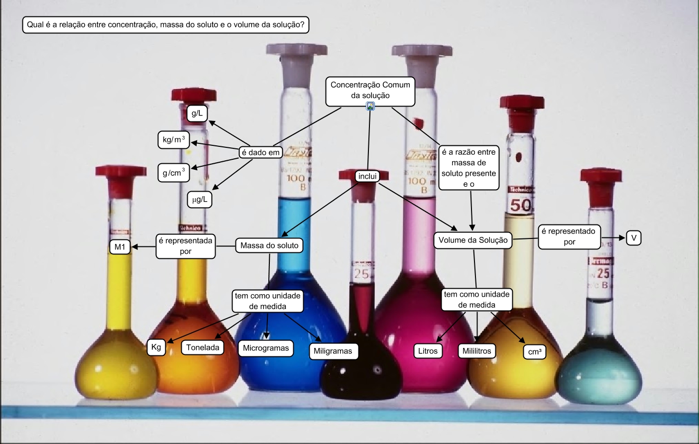 Esse mapa conceitual, produzido no IHMC CmapTools, tem a informação relacionada a: Concentração Comum MAMA, MICHELLE, STEFANIE,THABS,VINI, Massa do soluto tem como unidade de medida Tonelada, Concentração Comum da solução é dado em <math xmlns="http://www.w3.org/1998/Math/MathML"> <mrow> <mtext> kg/ </mtext> <mmultiscripts> <mtext> m </mtext> <none/> <mtext> 3 </mtext> </mmultiscripts> </mrow> </math>, Volume da Solução tem como unidade de medida cm³, Massa do soluto tem como unidade de medida Kg, Volume da Solução tem como unidade de medida Mililitros, Massa do soluto tem como unidade de medida Miligramas, Concentração Comum da solução é dado em <math xmlns="http://www.w3.org/1998/Math/MathML"> <mrow> <mtext> g </mtext> <mmultiscripts> <mtext> /cm </mtext> <none/> <mtext> 3 </mtext> </mmultiscripts> </mrow> </math>, Volume da Solução é representado por V, Massa do soluto é representada por M1, Massa do soluto tem como unidade de medida Microgramas, Volume da Solução tem como unidade de medida Litros, Concentração Comum da solução inclui Volume da Solução, Concentração Comum da solução é dado em g/L, Concentração Comum da solução é dado em μg/L, Concentração Comum da solução inclui Massa do soluto, Concentração Comum da solução é a razão entre massa de soluto presente e o Volume da Solução