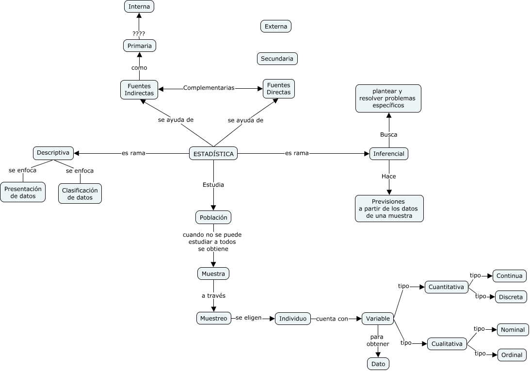Este Cmap, tiene información relacionada con: U1Estadística, Muestra a través Muestreo, Fuentes Indirectas como Primaria, Descriptiva se enfoca Presentación de datos, Variable tipo Cuantitativa, Cuantitativa tipo Continua, Individuo cuenta con Variable, Primaria ???? Interna, ESTADÍSTICA Estudia Población, Variable para obtener Dato, Muestreo se eligen Individuo, ESTADÍSTICA se ayuda de Fuentes Indirectas, Inferencial Hace Previsiones a partir de los datos de una muestra, Inferencial Busca plantear y resolver problemas específicos, Cuantitativa tipo Discreta, Variable tipo Cualitativa, ESTADÍSTICA es rama Inferencial, Población cuando no se puede estudiar a todos se obtiene Muestra, ESTADÍSTICA es rama Descriptiva, Cualitativa tipo Nominal, Cualitativa tipo Ordinal