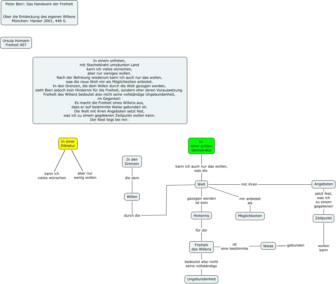 Dieses mit IHMC CmapTools erstellte CMap hat Informationen bezüglich: Ursula Homann Freiheit 007, Freiheit des Willens bedeutet also nicht seine vollständige Ungebundenheit, Angeboten setzt fest, was ich zu einem gegebenen Zeitpunkt, Welt mir anbietet als Möglichkeiten, In den Grenzen die dem Willen, Willen durch die Welt, Welt mit ihren Angeboten, In einer echten Demokratie kann ich auch nur das wollen, was die Welt, Freiheit des Willens ist eine bestimmte Weise, Welt gezogen werden ist kein Hinternis, Hinternis für die Freiheit des Willens
