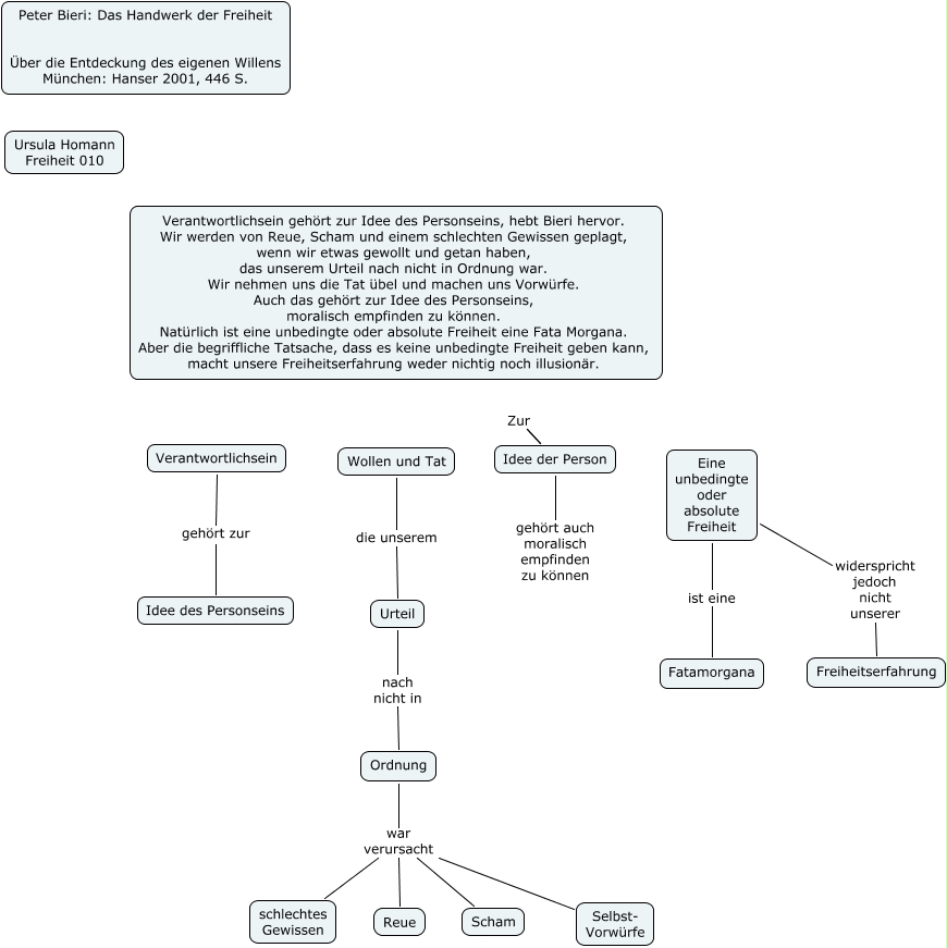 Dieses mit IHMC CmapTools erstellte CMap hat Informationen bezüglich: Ursula Homann Freiheit 010, Wollen und Tat die unserem Urteil, Eine unbedingte oder absolute Freiheit ist eine Fatamorgana, Ordnung war verursacht Reue, Ordnung war verursacht Scham, Urteil nach nicht in Ordnung, Ordnung war verursacht Selbst- Vorwürfe, Verantwortlichsein gehört zur Idee des Personseins, Eine unbedingte oder absolute Freiheit widerspricht jedoch nicht unserer Freiheitserfahrung, Ordnung war verursacht schlechtes Gewissen