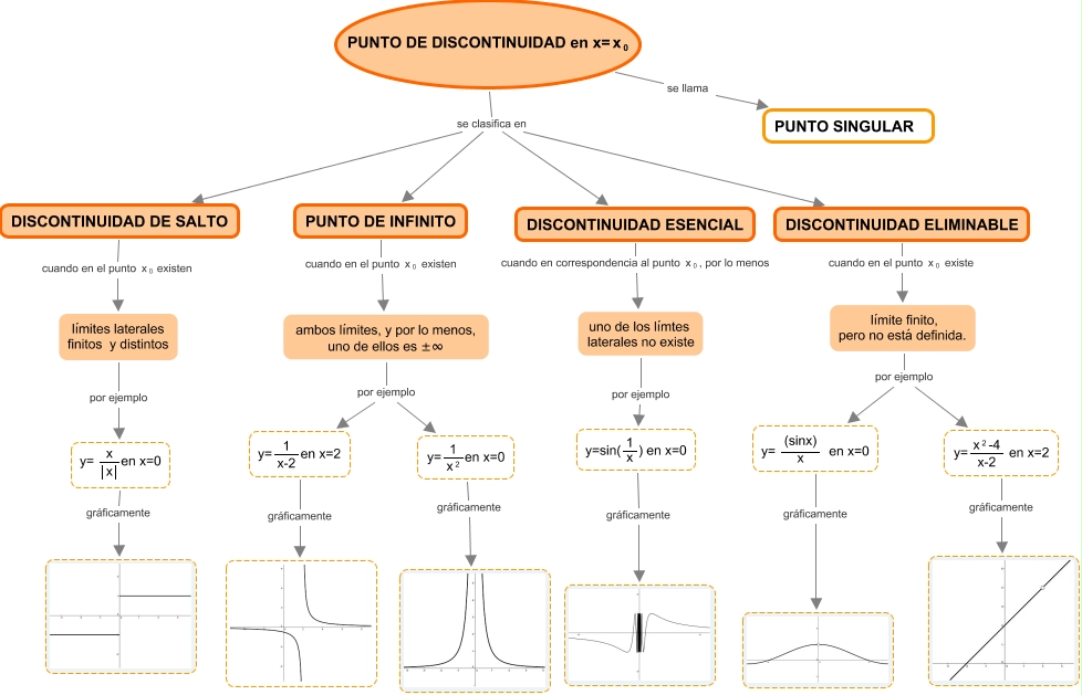 finitos y distintos </mtext> </math> por ejemplo <math xmlns="http://www.w3.org/1998/Math/MathML"> <mrow> <mtext> y= </mtext> <mfrac> <mtext> x </mtext> <mfenced open="|" close="|"> <mtext> x </mtext> </mfenced> </mfrac> <mtext> en x=0 </mtext> </mrow> </math>, <math xmlns="http://www.w3.org/1998/Math/MathML"> <mrow> <mtext> PUNTO DE DISCONTINUIDAD en x= </mtext> <mmultiscripts> <mtext> x </mtext> <mtext> 0 </mtext> <none/> </mmultiscripts> </mrow> </math> se clasifica en DISCONTINUIDAD DE SALTO, <math xmlns="http://www.w3.org/1998/Math/MathML"> <mrow> <mtext> PUNTO DE DISCONTINUIDAD en x= </mtext> <mmultiscripts> <mtext> x </mtext> <mtext> 0 </mtext> <none/> </mmultiscripts> </mrow> </math> se llama <math xmlns="http://www.w3.org/1998/Math/MathML"> <mrow> <mtext> PUNTO SINGULAR </mtext> </mrow> </math>, <math xmlns="http://www.w3.org/1998/Math/MathML"> <mrow> <mtext> y= </mtext> <mfrac> <mtext> 1 </mtext> <mtext> x-2 </mtext> </mfrac> <mtext> en x=2 </mtext> </mrow> </math> gráficamente, DISCONTINUIDAD ESENCIAL <math xmlns="http://www.w3.org/1998/Math/MathML"> <mrow> <mtext> cuando en correspondencia al punto </mtext> <mmultiscripts> <mtext> x </mtext> <mtext> 0 </mtext> <none/> </mmultiscripts> <mtext> , por lo menos </mtext> </mrow> </math> <math xmlns="http://www.w3.org/1998/Math/MathML"> <mtext> uno de los límtes