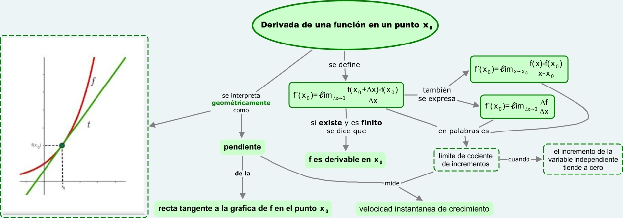 Este Cmap, tiene información relacionada con: DERIVADA DE UNA FUNCION EN UN PUNTO, <math xmlns="http://www.w3.org/1998/Math/MathML"> <mrow> <mtext> f´( </mtext> <mmultiscripts> <mtext> x </mtext> <mtext> 0 </mtext> <none/> </mmultiscripts> <mtext> )= </mtext> <mmultiscripts> <mtext> ℓim </mtext> <mtext> Δx→0 </mtext> <none/> </mmultiscripts> <mfrac> <mrow> <mtext> f( </mtext> <mmultiscripts> <mtext> x </mtext> <mtext> 0 </mtext> <none/> </mmultiscripts> <mtext> +Δx)-f( </mtext> <mmultiscripts> <mtext> x </mtext> <mtext> 0 </mtext> <none/> </mmultiscripts> <mtext> ) </mtext> </mrow> <mtext> Δx </mtext> </mfrac> </mrow> </math> también se expresa <math xmlns="http://www.w3.org/1998/Math/MathML"> <mrow> <mtext> f´( </mtext> <mmultiscripts> <mtext> x </mtext> <mtext> 0 </mtext> <none/> </mmultiscripts> <mtext> )= </mtext> <mmultiscripts> <mtext> ℓim </mtext> <mrow> <mtext> x→ </mtext> <mmultiscripts> <mtext> x </mtext> <mtext> 0 </mtext> <none/> </mmultiscripts> </mrow> <none/> </mmultiscripts> <mfrac> <mrow> <mtext> f( </mtext> <mtext> x)-f( </mtext> <mmultiscripts> <mtext> x </mtext> <mtext> 0 </mtext> <none/> </mmultiscripts> <mtext> ) </mtext> </mrow> <mrow> <mtext> x- </mtext> <mmultiscripts> <mtext> x </mtext> <mtext> 0 </mtext> <none/> </mmultiscripts> </mrow> </mfrac> </mrow> </math>, <math xmlns="http://www.w3.org/1998/Math/MathML"> <mrow> <mtext> f´( </mtext> <mmultiscripts> <mtext> x </mtext> <mtext> 0 </mtext> <none/> </mmultiscripts> <mtext> )= </mtext> <mmultiscripts> <mtext> ℓim </mtext> <mtext> Δx→0 </mtext> <none/> </mmultiscripts> <mfrac> <mrow> <mtext> f( </mtext> <mmultiscripts> <mtext> x </mtext> <mtext> 0 </mtext> <none/> </mmultiscripts> <mtext> +Δx)-f( </mtext> <mmultiscripts> <mtext> x </mtext> <mtext> 0 </mtext> <none/> </mmultiscripts> <mtext> ) </mtext> </mrow> <mtext> Δx </mtext> </mfrac> </mrow> </math> si existe y es finito se dice que <math xmlns="http://www.w3.org/1998/Math/MathML"> <mrow> <mtext> f es derivable en </mtext> <mmultiscripts> <mtext> x </mtext> <mtext> 0 </mtext> <none/> </mmultiscripts> </mrow> </math>, <math xmlns="http://www.w3.org/1998/Math/MathML"> <mrow> <mtext> Derivada de una función en un punto </mtext> <mmultiscripts> <mtext> x </mtext> <mtext> 0 </mtext> <none/> </mmultiscripts> </mrow> </math> se interpreta geométricamente como pendiente, <math xmlns="http://www.w3.org/1998/Math/MathML"> <mrow> <mtext> f´( </mtext> <mmultiscripts> <mtext> x </mtext> <mtext> 0 </mtext> <none/> </mmultiscripts> <mtext> )= </mtext> <mmultiscripts> <mtext> ℓim </mtext> <mtext> Δx→0 </mtext> <none/> </mmultiscripts> <mfrac> <mrow> <mtext> f( </mtext> <mmultiscripts> <mtext> x </mtext> <mtext> 0 </mtext> <none/> </mmultiscripts> <mtext> +Δx)-f( </mtext> <mmultiscripts> <mtext> x </mtext> <mtext> 0 </mtext> <none/> </mmultiscripts> <mtext> ) </mtext> </mrow> <mtext> Δx </mtext> </mfrac> </mrow> </math> también se expresa <math xmlns="http://www.w3.org/1998/Math/MathML"> <mrow> <mtext> f´( </mtext> <mmultiscripts> <mtext> x </mtext> <mtext> 0 </mtext> <none/> </mmultiscripts> <mtext> )= </mtext> <mmultiscripts> <mtext> ℓim </mtext> <mtext> Δx→0 </mtext> <none/> </mmultiscripts> <mfrac> <mrow> <mtext> Δf </mtext> </mrow> <mtext> Δx </mtext> </mfrac> </mrow> </math>, <math xmlns="http://www.w3.org/1998/Math/MathML"> <mrow> <mtext> f´( </mtext> <mmultiscripts> <mtext> x </mtext> <mtext> 0 </mtext> <none/> </mmultiscripts> <mtext> )= </mtext> <mmultiscripts> <mtext> ℓim </mtext> <mtext> Δx→0 </mtext> <none/> </mmultiscripts> <mfrac> <mrow> <mtext> Δf </mtext> </mrow> <mtext> Δx </mtext> </mfrac> </mrow> </math> en palabras es límite de cociente de incrementos, <math xmlns="http://www.w3.org/1998/Math/MathML"> <mrow> <mtext> Derivada de una función en un punto </mtext> <mmultiscripts> <mtext> x </mtext> <mtext> 0 </mtext> <none/> </mmultiscripts> </mrow> </math> se define <math xmlns="http://www.w3.org/1998/Math/MathML"> <mrow> <mtext> f´( </mtext> <mmultiscripts> <mtext> x </mtext> <mtext> 0 </mtext> <none/> </mmultiscripts> <mtext> )= </mtext> <mmultiscripts> <mtext> ℓim </mtext> <mtext> Δx→0 </mtext> <none/> </mmultiscripts> <mfrac> <mrow> <mtext> f( </mtext> <mmultiscripts> <mtext> x </mtext> <mtext> 0 </mtext> <none/> </mmultiscripts> <mtext> +Δx)-f( </mtext> <mmultiscripts> <mtext> x </mtext> <mtext> 0 </mtext> <none/> </mmultiscripts> <mtext> ) </mtext> </mrow> <mtext> Δx </mtext> </mfrac> </mrow> </math>, límite de cociente de incrementos mide velocidad instantanea de crecimiento, pendiente de la <math xmlns="http://www.w3.org/1998/Math/MathML"> <mrow> <mtext> recta tangente a la gráfica de f en el punto </mtext> <mmultiscripts> <mtext> x </mtext> <mtext> 0 </mtext> <none/> </mmultiscripts> </mrow> </math>, <math xmlns="http://www.w3.org/1998/Math/MathML"> <mrow> <mtext> f´( </mtext> <mmultiscripts> <mtext> x </mtext> <mtext> 0 </mtext> <none/> </mmultiscripts> <mtext> )= </mtext> <mmultiscripts> <mtext> ℓim </mtext> <mtext> Δx→0 </mtext> <none/> </mmultiscripts> <mfrac> <mrow> <mtext> f( </mtext> <mmultiscripts> <mtext> x </mtext> <mtext> 0 </mtext> <none/> </mmultiscripts> <mtext> +Δx)-f( </mtext> <mmultiscripts> <mtext> x </mtext> <mtext> 0 </mtext> <none/> </mmultiscripts> <mtext> ) </mtext> </mrow> <mtext> Δx </mtext> </mfrac> </mrow> </math> en palabras es límite de cociente de incrementos, pendiente mide velocidad instantanea de crecimiento, <math xmlns="http://www.w3.org/1998/Math/MathML"> <mrow> <mtext> f´( </mtext> <mmultiscripts> <mtext> x </mtext> <mtext> 0 </mtext> <none/> </mmultiscripts> <mtext> )= </mtext> <mmultiscripts> <mtext> ℓim </mtext> <mrow> <mtext> x→ </mtext> <mmultiscripts> <mtext> x </mtext> <mtext> 0 </mtext> <none/> </mmultiscripts> </mrow> <none/> </mmultiscripts> <mfrac> <mrow> <mtext> f( </mtext> <mtext> x)-f( </mtext> <mmultiscripts> <mtext> x </mtext> <mtext> 0 </mtext> <none/> </mmultiscripts> <mtext> ) </mtext> </mrow> <mrow> <mtext> x- </mtext