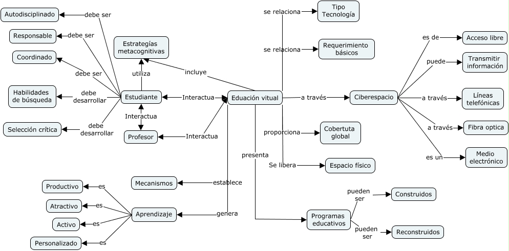 Este Cmap, tiene información relacionada con: Aproximaciones, Eduación vitual presenta Programas educativos, Estudiante debe desarrollar Habilidades de búsqueda, Eduación vitual genera Aprendizaje, Ciberespacio es un Medio electrónico, Ciberespacio a través Líneas telefónicas, Estudiante debe ser Responsable, Eduación vitual incluye Estrategías metacognitivas, Estudiante utiliza Estrategías metacognitivas, Ciberespacio puede Transmitir información, Eduación vitual se relaciona Tipo Tecnología, Programas educativos pueden ser Construidos, Eduación vitual a través Ciberespacio, Eduación vitual establece Mecanismos, Estudiante debe ser Autodisciplinado, Ciberespacio es de Acceso libre, Eduación vitual Se libera Espacio físico, Eduación vitual proporciona Cobertuta global, Aprendizaje es Productivo, Estudiante debe ser Coordinado, Aprendizaje es Atractivo