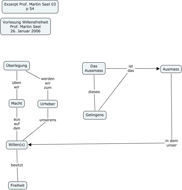 Dieses mit IHMC CmapTools erstellte CMap hat Informationen bezüglich: Exzerpt Prof. Martin Seel 03 p 54, Urheber unserens Willen(s), Willen(s) besitzt Freiheit, Macht aus auf den Willen(s), Ausmass in dem unser Willen(s), Das Aussmass ist das Ausmass, Das Aussmass dieses Gelingens, Gelingens ist das Ausmass, Überlegung werden wir zum Urheber, Überlegung üben wir Macht