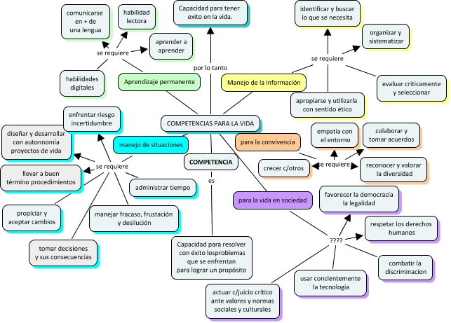 Este Cmap, tiene información relacionada con: competencias para la vida, Manejo de la información se requiere apropiarse y utilizarla con sentido ético, COMPETENCIAS PARA LA VIDA ???? Aprendizaje permanente, manejo de situaciones se requiere administrar tiempo, manejo de situaciones se requiere propiciar y aceptar cambios, COMPETENCIAS PARA LA VIDA ???? para la convivencia, Manejo de la información se requiere identificar y buscar lo que se necesita, COMPETENCIAS PARA LA VIDA ???? Manejo de la información, para la vida en sociedad ???? favorecer la democracia la legalidad, para la convivencia se requiere empatia con el entorno, Aprendizaje permanente se requiere comunicarse en + de una lengua, para la convivencia se requiere crecer c/otros, manejo de situaciones se requiere tomar decisiones y sus consecuencias, Manejo de la información se requiere evaluar criticamente y seleccionar, para la vida en sociedad ???? respetar los derechos humanos, para la convivencia se requiere colaborar y tomar acuerdos, manejo de situaciones se requiere enfrentar riesgo incertidumbre, para la convivencia se requiere reconocer y valorar la diversidad, COMPETENCIA es Capacidad para resolver con éxito losproblemas que se enfrentan para lograr un propósito, manejo de situaciones se requiere llevar a buen término procedimientos, para la vida en sociedad ???? combatir la discriminacion