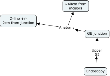 This Concept Map, created with IHMC CmapTools, has information related to: EGD endoscopy, Endoscopy Upper GI GE junction, GE junction Anatomy Z-line +/- 2cm from junction, GE junction Anatomy ~40cm from incisors