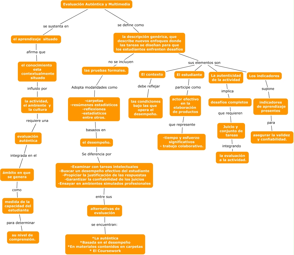 Este Cmap, tiene información relacionada con: Evaluación Autentica y Multimedia, Juicio y conjunto de tareas integrando la evaluación a la actividad., la descripción genérica, que describe nuevos enfoques donde las tareas se diseñan para que los estudiantes enfrenten desafíos no se incluyen las pruebas formales., indicadores de aprendizaje presentes para asegurar la validez y confiabilidad., alternativas de evaluación se encuentran: *La auténtica *Basada en el desempeño *En materiales contenidos en carpetas * El Coursework, ámbito en que se genera como medida de la capacidad del estudiante, Los indicadores supone indicadores de aprendizaje presentes, la actividad, el ambiente y la cultura requiere una evaluación auténtica, la descripción genérica, que describe nuevos enfoques donde las tareas se diseñan para que los estudiantes enfrenten desafíos sus elementos son El estudiante, evaluación auténtica integrada en el ámbito en que se genera, la descripción genérica, que describe nuevos enfoques donde las tareas se diseñan para que los estudiantes enfrenten desafíos sus elementos son La autenticidad de la actividad, La autenticidad de la actividad implica desafíos completos, desafíos completos que requieren Juicio y conjunto de tareas, el conocimiento esta contextualmente situado influido por la actividad, el ambiente y la cultura, el aprendizaje situado afirma que el conocimiento esta contextualmente situado, El contexto debe reflejar las condiciones bajo las que opera el desempeño., Evaluación Auténtica y Multimedia se define como la descripción genérica, que describe nuevos enfoques donde las tareas se diseñan para que los estudiantes enfrenten desafíos, la descripción genérica, que describe nuevos enfoques donde las tareas se diseñan para que los estudiantes enfrenten desafíos sus elementos son Los indicadores, el desempeño. Se diferencia por -Examinar con tareas intelectuales -Buscar un desempeño efectivo del estudiante -Propiciar la justificación de las respuestas -Garantizar la confiabilidad de los juicios -Ensayar en ambientes simulados profesionales, -Examinar con tareas intelectuales -Buscar un desempeño efectivo del estudiante -Propiciar la justificación de las respuestas -Garantizar la confiabilidad de los juicios -Ensayar en ambientes simulados profesionales entre sus alternativas de evaluación, las pruebas formales. Adopta modalidades como -carpetas -resúmenes estadísticos -reflexiones -estadísticos entre otros.