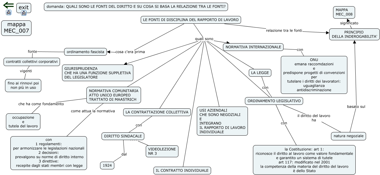 Questa Cmap, creata con IHMC CmapTools, contiene informazioni relative a: MEC_007, LE FONTI DI DISCIPLINA DEL RAPPORTO DI LAVORO quali sono LA CONTRATTAZIONE COLLETTIVA, NORMATIVA COMUNITARIA ATTO UNICO EUROPEO TRATTATO DI MAASTRICH come attua la normativa con 1 regolamenti: per armonizzare le legislazioni nazionali 2 decisioni: prevalgono su norme di diritto interno 3 direttive: recepite dagli stati membri con legge, LA CONTRATTAZIONE COLLETTIVA con DIRITTO SINDACALE, LE FONTI DI DISCIPLINA DEL RAPPORTO DI LAVORO quali sono IL CONTRATTO INDIVIDUALE, ordinamento fascista fonte contratti collettivi corporativi, LE FONTI DI DISCIPLINA DEL RAPPORTO DI LAVORO quali sono USI AZIENDALI CHE SONO NEGOZIALI E INTEGRANO IL RAPPORTO DI LAVORO INDIVIDUALE, LE FONTI DI DISCIPLINA DEL RAPPORTO DI LAVORO quali sono NORMATIVA COMUNITARIA ATTO UNICO EUROPEO TRATTATO DI MAASTRICH, ORDINAMENTO LEGISLATIVO con la Costituzione: art 1: riconosce il diritto al lavoro come valore fondamentale e garantito un sistema di tutele art 117: modificato nel 2001 la competenza della materia del diritto del lavoro è dello Stato, NORMATIVA COMUNITARIA ATTO UNICO EUROPEO TRATTATO DI MAASTRICH che ha come fondamento occupazione e tutela del lavoro, DIRITTO SINDACALE dal 1924, NORMATIVA INTERNAZIONALE con ONU emana raccomdazioni e predispone progetti di convenzioni per tutelare i diritti dei lavoratori: uguaglianza antidiscriminazione, natura negoziale basato sul PRINCIPIO DELLA INDEROGABILITA', LE FONTI DI DISCIPLINA DEL RAPPORTO DI LAVORO quali sono GIURISPRUDENZA CHE HA UNA FUNZIONE SUPPLETIVA DEL LEGISLATORE, LA LEGGE con ORDINAMENTO LEGISLATIVO, LE FONTI DI DISCIPLINA DEL RAPPORTO DI LAVORO cosa c'era prima ordinamento fascista, contratti collettivi corporativi vigenti fino ai rinnovi poi non più in uso, PRINCIPIO DELLA INDEROGABILITA' significato MAPPA MEC_008, LE FONTI DI DISCIPLINA DEL RAPPORTO DI LAVORO relazione tra le fonti PRINCIPIO DELLA INDEROGABILITA', LE FONTI DI DISCIPLINA DEL RAPPORTO DI LAVORO quali sono LA LEGGE, DIRITTO SINDACALE ???? VIDEOLEZIONE NR 3