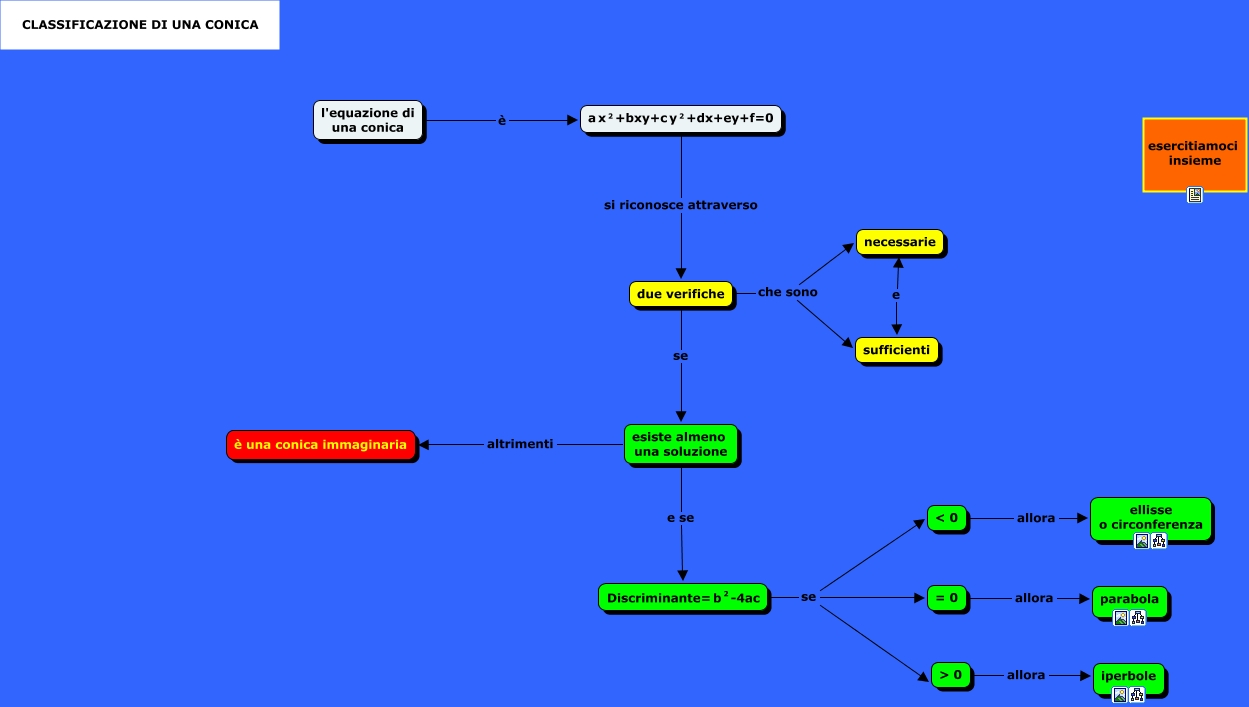 Questa Cmap, creata con IHMC CmapTools, contiene informazioni relative a: Classificazione di una conica, due verifiche se esiste almeno una soluzione, <math xmlns="http://www.w3.org/1998/Math/MathML"> <mrow> <mtext> a </mtext> <mmultiscripts> <mtext> x </mtext> <none/> <mtext> 2 </mtext> </mmultiscripts> <mtext> +bxy+c </mtext> <mmultiscripts> <mtext> y </mtext> <none/> <mtext> 2 </mtext> </mmultiscripts> <mtext> +dx+ey+f=0 </mtext> </mrow> </math> si riconosce attraverso due verifiche, < 0 allora ellisse o circonferenza, <math xmlns="http://www.w3.org/1998/Math/MathML"> <mrow> <mtext> Discriminante= </mtext> <mmultiscripts> <mtext> b </mtext> <none/> <mtext> 2 </mtext> </mmultiscripts> <mtext> -4ac </mtext> </mrow> </math> se < 0, due verifiche che sono sufficienti, l'equazione di una conica è <math xmlns="http://www.w3.org/1998/Math/MathML"> <mrow> <mtext> a </mtext> <mmultiscripts> <mtext> x </mtext> <none/> <mtext> 2 </mtext> </mmultiscripts> <mtext> +bxy+c </mtext> <mmultiscripts> <mtext> y </mtext> <none/> <mtext> 2 </mtext> </mmultiscripts> <mtext> +dx+ey+f=0 </mtext> </mrow> </math>, <math xmlns="http://www.w3.org/1998/Math/MathML"> <mrow> <mtext> Discriminante= </mtext> <mmultiscripts> <mtext> b </mtext> <none/> <mtext> 2 </mtext> </mmultiscripts> <mtext> -4ac </mtext> </mrow> </math> se > 0, due verifiche che sono necessarie, esiste almeno una soluzione altrimenti è una conica immaginaria, = 0 allora parabola, <math xmlns="http://www.w3.org/1998/Math/MathML"> <mrow> <mtext> Discriminante= </mtext> <mmultiscripts> <mtext> b </mtext> <none/> <mtext> 2 </mtext> </mmultiscripts> <mtext> -4ac </mtext> </mrow> </math> se = 0, > 0 allora iperbole, esiste almeno una soluzione e se <math xmlns="http://www.w3.org/1998/Math/MathML"> <mrow> <mtext> Discriminante= </mtext> <mmultiscripts> <mtext> b </mtext> <none/> <mtext> 2 </mtext> </mmultiscripts> <mtext> -4ac </mtext> </mrow> </math>