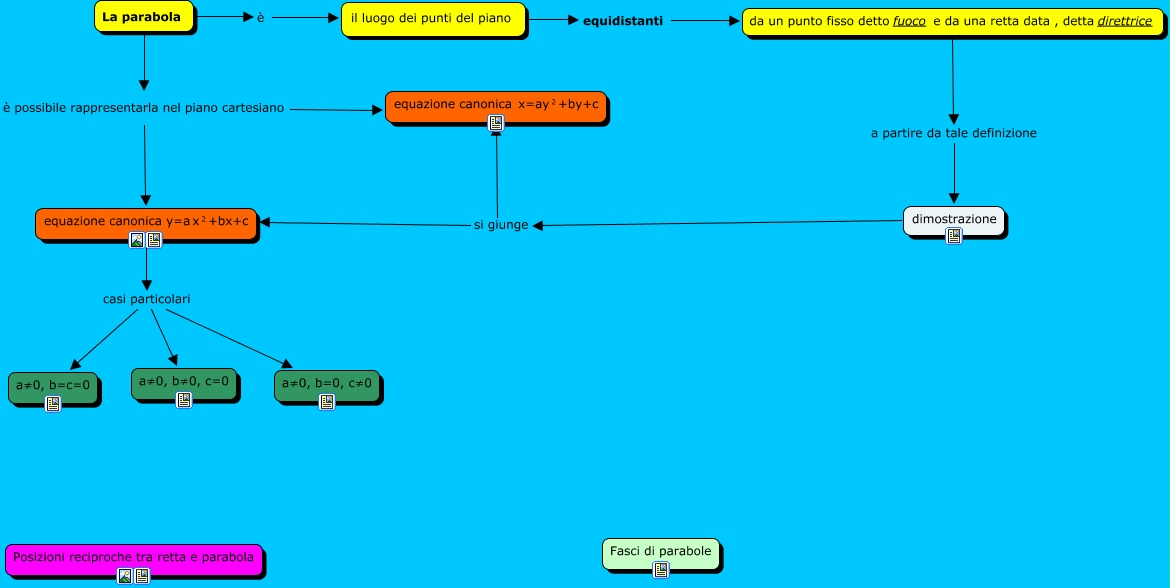 Questa Cmap, creata con IHMC CmapTools, contiene informazioni relative a: La parabola, <math xmlns="http://www.w3.org/1998/Math/MathML"> <mrow> <mtext> equazione canonica y=a </mtext> <mmultiscripts> <mtext> x </mtext> <none/> <mtext> 2 </mtext> </mmultiscripts> <mtext> +bx+c </mtext> </mrow> </math> casi particolari a≠0, b=c=0, da un punto fisso detto fuoco e da una retta data , detta direttrice a partire da tale definizione dimostrazione, La parabola è il luogo dei punti del piano, il luogo dei punti del piano equidistanti da un punto fisso detto fuoco e da una retta data , detta direttrice, dimostrazione si giunge <math xmlns="http://www.w3.org/1998/Math/MathML"> <mrow> <mtext> equazione canonica y=a </mtext> <mmultiscripts> <mtext> x </mtext> <none/> <mtext> 2 </mtext> </mmultiscripts> <mtext> +bx+c </mtext> </mrow> </math>, La parabola è possibile rappresentarla nel piano cartesiano <math xmlns="http://www.w3.org/1998/Math/MathML"> <mrow> <mtext> equazione canonica </mtext> <mmultiscripts> <mtext> x=ay </mtext> <none/> <mtext> 2 </mtext> </mmultiscripts> <mtext> +by+c </mtext> </mrow> </math>, La parabola è possibile rappresentarla nel piano cartesiano <math xmlns="http://www.w3.org/1998/Math/MathML"> <mrow> <mtext> equazione canonica y=a </mtext> <mmultiscripts> <mtext> x </mtext> <none/> <mtext> 2 </mtext> </mmultiscripts> <mtext> +bx+c </mtext> </mrow> </math>, <math xmlns="http://www.w3.org/1998/Math/MathML"> <mrow> <mtext> equazione canonica y=a </mtext> <mmultiscripts> <mtext> x </mtext> <none/> <mtext> 2 </mtext> </mmultiscripts> <mtext> +bx+c </mtext> </mrow> </math> casi particolari a≠0, b≠0, c=0, <math xmlns="http://www.w3.org/1998/Math/MathML"> <mrow> <mtext> equazione canonica y=a </mtext> <mmultiscripts> <mtext> x </mtext> <none/> <mtext> 2 </mtext> </mmultiscripts> <mtext> +bx+c </mtext> </mrow> </math> casi particolari a≠0, b=0, c≠0, dimostrazione si giunge <math xmlns="http://www.w3.org/1998/Math/MathML"> <mrow> <mtext> equazione canonica </mtext> <mmultiscripts> <mtext> x=ay </mtext> <none/> <mtext> 2 </mtext> </mmultiscripts> <mtext> +by+c </mtext> </mrow> </math>