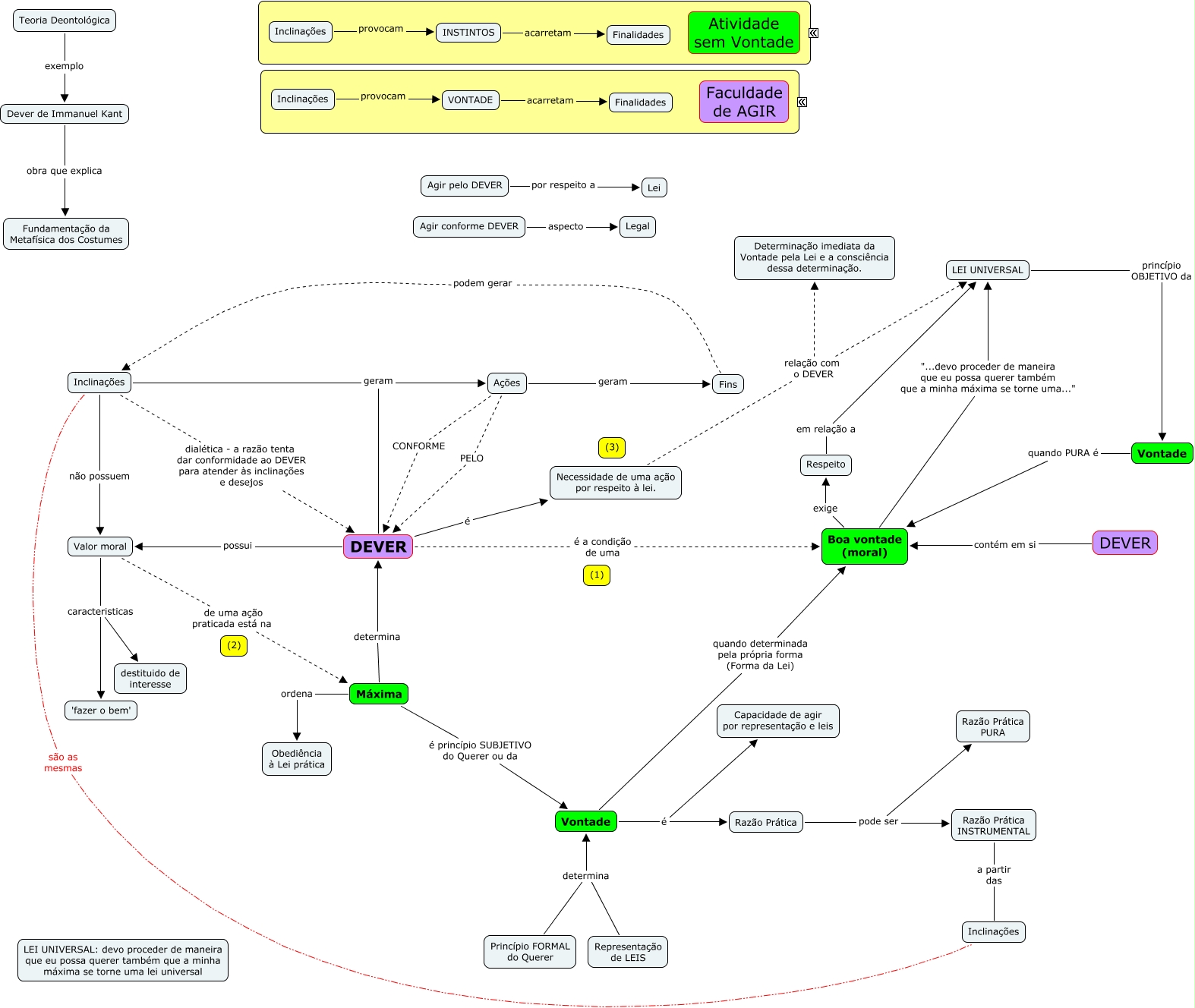 Esse mapa conceitual, produzido no IHMC CmapTools, tem a informação relacionada a: Kant, Ações geram Fins, Fins podem gerar Inclinações, Inclinações provocam VONTADE, Valor moral de uma ação praticada está na Máxima, VONTADE acarretam Finalidades, Teoria Deontológica exemplo Dever de Immanuel Kant, Razão Prática INSTRUMENTAL a partir das Inclinações, Inclinações geram Ações, Máxima determina DEVER, Necessidade de uma ação por respeito à lei. relação com o DEVER Determinação imediata da Vontade pela Lei e a consciência dessa determinação., Inclinações provocam INSTINTOS, Inclinações não possuem Valor moral, Princípio FORMAL do Querer determina Vontade, Vontade quando determinada pela própria forma (Forma da Lei) Boa vontade (moral), Agir pelo DEVER por respeito a Lei, DEVER geram Ações, Vontade quando PURA é Boa vontade (moral), DEVER é Necessidade de uma ação por respeito à lei., Boa vontade (moral) exige Respeito, DEVER possui Valor moral