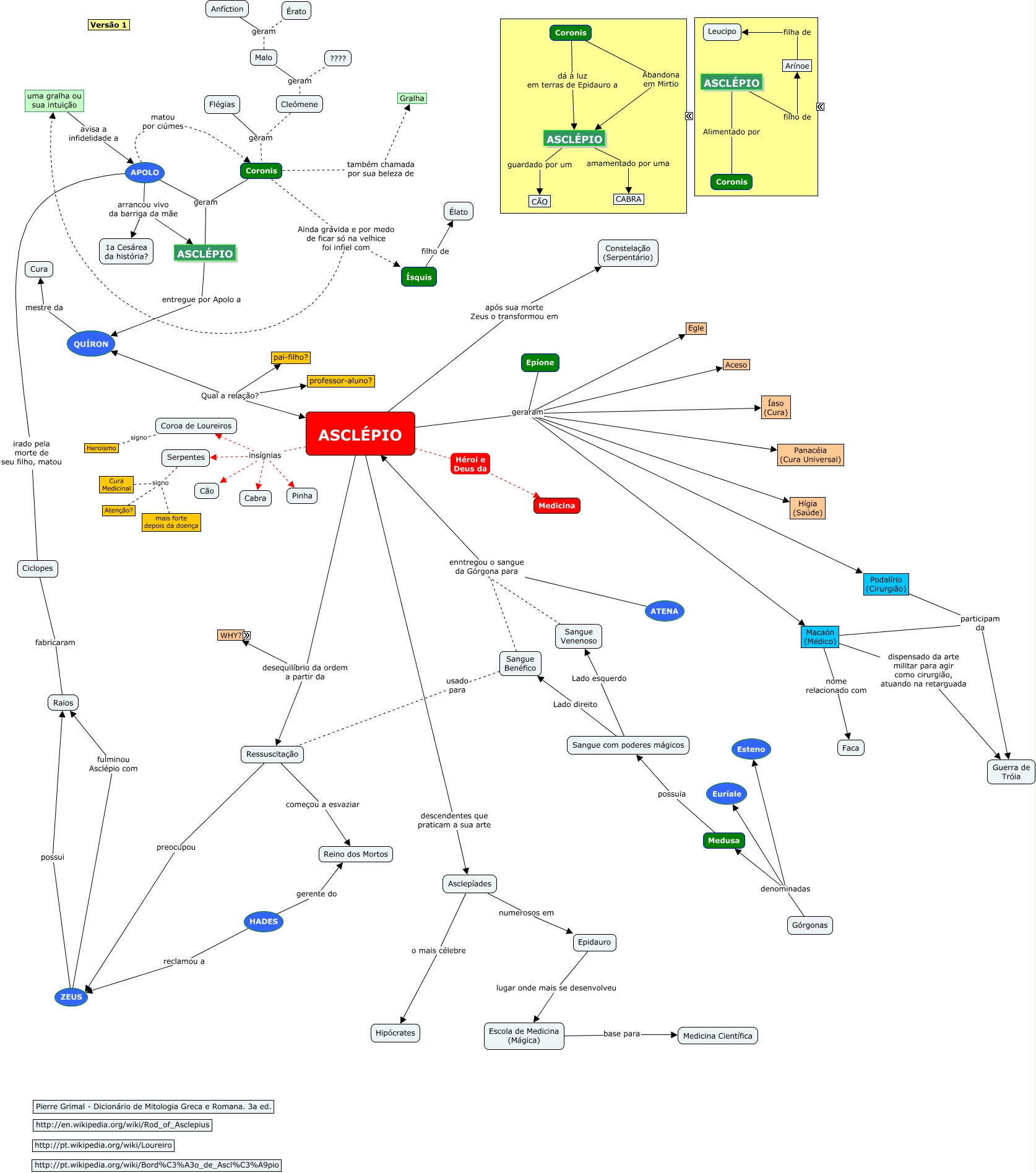 Esse mapa conceitual, produzido no IHMC CmapTools, tem a informação relacionada a: Asclépio, Coronis Abandona em Mirtio ASCLÉPIO, Serpentes signo Cura Medicinal, ASCLÉPIO Héroi e Deus da Medicina, APOLO arrancou vivo da barriga da mãe ASCLÉPIO, Epíone geraram Egle, Epíone geraram Íaso (Cura), ASCLÉPIO desequilíbrio da ordem a partir da WHY?, QUÍRON mestre da Cura, Górgonas denominadas Euríale, Érato geram Malo, ASCLÉPIO filho de Arínoe, Coronis dá à luz em terras de Epidauro a ASCLÉPIO, ASCLÉPIO guardado por um CÃO, Ciclopes fabricaram Raios, Anfíction geram Malo, Sangue Benéfico usado para Ressuscitação, Coronis Ainda grávida e por medo de ficar só na velhice foi infiel com uma gralha ou sua intuição, Macaón (Médico) dispensado da arte militar para agir como cirurgião, atuando na retarguada Guerra de Tróia, Epíone geraram Aceso, Epíone geraram Podalírio (Cirurgião)