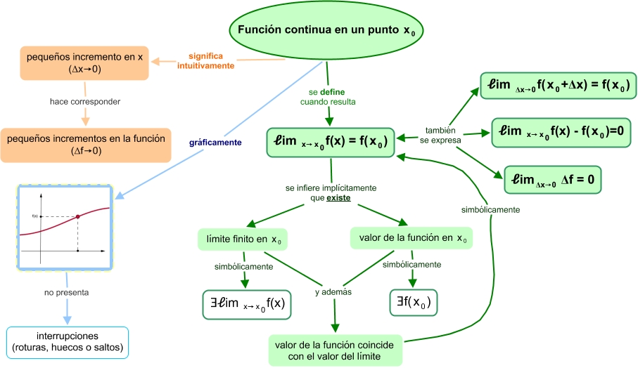 (Δf→0) </mtext> </mrow> </math>, no presenta interrupciones (roturas, huecos o saltos), <math xmlns="http://www.w3.org/1998/Math/MathML"> <mrow> <mtext> valor de la función en </mtext> <mmultiscripts> <mtext> x </mtext> <mtext> 0 </mtext> <none/> </mmultiscripts> </mrow> </math> simbólicamente <math xmlns="http://www.w3.org/1998/Math/MathML"> <mrow> <mtext> ∃f( </mtext> <mmultiscripts> <mtext> x </mtext> <mtext> 0 </mtext> <none/> </mmultiscripts> <mtext> ) </mtext> </mrow> </math>, <math xmlns="http://www.w3.org/1998/Math/MathML"> <mrow> <mtext> valor de la función en </mtext> <mmultiscripts> <mtext> x </mtext> <mtext> 0 </mtext> <none/> </mmultiscripts> </mrow> </math> y además <math xmlns="http://www.w3.org/1998/Math/MathML"> <mrow> <mtext> valor de la función coincide