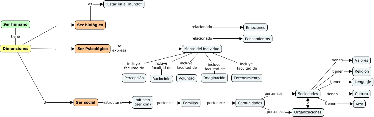 Este Cmap, tiene información relacionada con: U21, Sociedades tienen Arte, Dimensiones 1 Ser biológico, Ser social estructura mit sein (ser con), Mente del individuo incluye facultad de Entendimiento, Dimensiones 3 Ser social, Sociedades tienen Cultura, Mente del individuo relacionado Pensamientos, Mente del individuo incluye facultad de Raciocinio, mit sein (ser con) pertence Familias, Familias pertenece Comunidades, Sociedades tienen Religión, Sociedades tienen Valores, Mente del individuo incluye facultad de Percepción, Ser biológico es "Estar en el mundo", Mente del individuo incluye facultad de Voluntad, Mente del individuo incluye facultad de Imaginación, Mente del individuo relacionado Emociones, Ser Psicológico se expresa Mente del individuo, Comunidades pertenece Organizaciones, Comunidades pertenece Sociedades