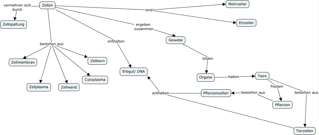 Dieses mit IHMC CmapTools erstellte CMap hat Informationen bezüglich: Zelle_Kerstin Sodtke, Pflanzen bestehen aus Pflanzenzellen, Zellen bestehen aus Cytoplasma, Pflanzenzellen enthalten Erbgut/ DNA, Zellen vermehren sich durch Zellspaltung, Tiere bestehen aus Tierzellen, Zellen bestehen aus Zellwand, Zellen enthalten Erbgut/ DNA, Tierzellen enthalten Erbgut/ DNA, Zellen bestehen aus Zellkern, Zellen sind Einzeller, Gewebe bilden Organe, Zellen bestehen aus Zellplasma, Organe haben Tiere, Tiere fressen Pflanzen, Zellen sind Mehrzeller, Zellen bestehen aus Zellmembran, Zellen ergeben zusammen Gewebe