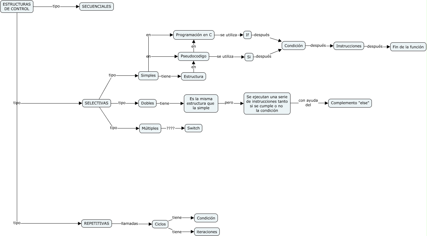 Este Cmap, tiene información relacionada con: EstructurasCtrl, REPETITIVAS llamadas Ciclos, ESTRUCTURAS DE CONTROL tipo REPETITIVAS, Se ejecutan una serie de instrucciones tanto si se cumple o no la condición con ayuda del Complemento "else", Dobles tiene Es la misma estructura que la simple, Ciclos tiene iteraciones, Ciclos tiene Condición, Si después Condición, Instrucciones después Fin de la función, ESTRUCTURAS DE CONTROL tipo SELECTIVAS, Múltiples ???? Switch, Condición después Instrucciones, SELECTIVAS tipo Dobles, Es la misma estructura que la simple pero Se ejecutan una serie de instrucciones tanto si se cumple o no la condición, SELECTIVAS tipo Múltiples, If después Condición, Estructura en Pseudocodigo, Pseudocodigo en Programación en C, Simples en Programación en C, Pseudocodigo se utiliza Si, ESTRUCTURAS DE CONTROL tipo SECUENCIALES