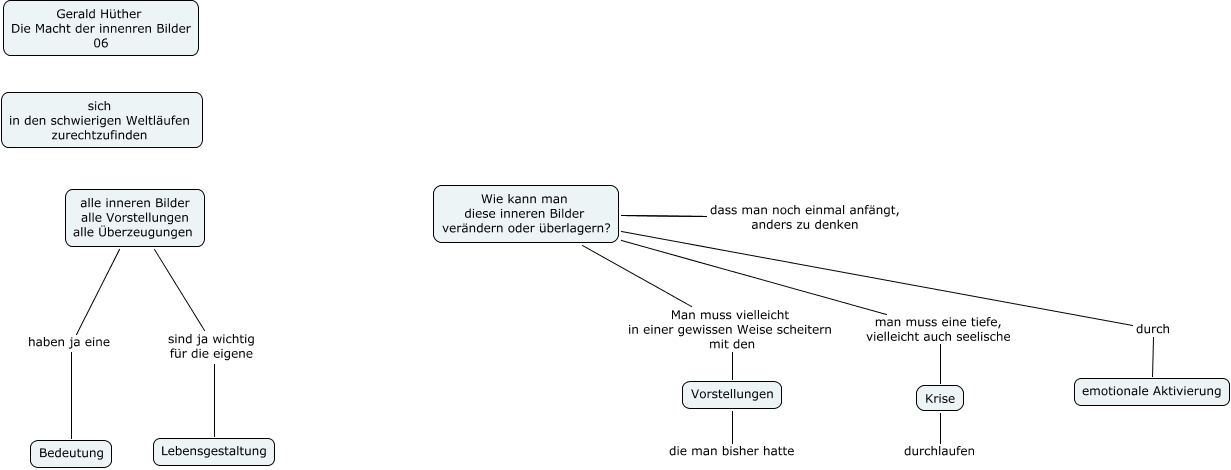 Dieses mit IHMC CmapTools erstellte CMap hat Informationen bezüglich: 06 Die Macht der innenren Bilder, alle inneren Bilder alle Vorstellungen alle Überzeugungen haben ja eine Bedeutung, Wie kann man diese inneren Bilder verändern oder überlagern? Man muss vielleicht in einer gewissen Weise scheitern mit den Vorstellungen, Wie kann man diese inneren Bilder verändern oder überlagern? durch emotionale Aktivierung, Wie kann man diese inneren Bilder verändern oder überlagern? man muss eine tiefe, vielleicht auch seelische Krise, alle inneren Bilder alle Vorstellungen alle Überzeugungen sind ja wichtig für die eigene Lebensgestaltung