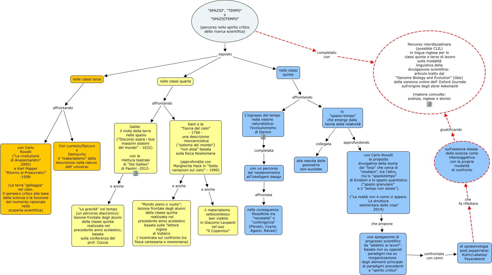 Questa Cmap, creata con IHMC CmapTools, contiene informazioni relative a: SPAZIO -TEMPO e SPAZIOTEMPO, "SPAZIO", "TEMPO" e "SPAZIOTEMPO" (percorso nello spirito critico della ricerca scientifica) esposto nelle classi quinte, nelle classi terze affrontando Con Lucrezio/Epicuro e Democrito il "materialismo" della descrizione nella natura dell' universo, "SPAZIO", "TEMPO" e "SPAZIOTEMPO" (percorso nello spirito critico della ricerca scientifica) completato con Percorso interdisciplinare (possibile CLIL) in lingua inglese per le classi quinte e terze di lavoro sulla modalità linguistica della divulgazione scientifica: articolo tratto dal “Genome Biology and Evolution” (Gbe) della versione online dell' Oxford Journals sull'origine degli ebrei Askenaziti (materie coinvolte: scienze, inglese e storia), nelle classi quinte affrontando L'ingresso del tempo nella visione naturalistica: l'evoluzionismo di Darwin, nelle classi quinte affrontando lo "spazio-tempo" che emerge dalla teoria della relatività, lo "spazio-tempo" che emerge dalla teoria della relatività collegata alla nascita delle geometrie non-euclidee, "SPAZIO", "TEMPO" e "SPAZIOTEMPO" (percorso nello spirito critico della ricerca scientifica) esposto nelle classi terze, con un percorso dal neodarwinismo all'Intelligent design affrontata nelle conseguenze filosofiche tra "necessità" e "contingenza" (Pievani, Coyne, Agazzi, Ravasi), sull'essenza stessa della scienza come intersoggettiva con la propria modalità di confronto giustificando Percorso interdisciplinare (possibile CLIL) in lingua inglese per le classi quinte e terze di lavoro sulla modalità linguistica della divulgazione scientifica: articolo tratto dal “Genome Biology and Evolution” (Gbe) della versione online dell' Oxford Journals sull'origine degli ebrei Askenaziti (materie coinvolte: scienze, inglese e storia), di epistemologia post popperiana: Kuhn/Lakatos/ Feyerabend che fa riflettere sull'essenza stessa della scienza come intersoggettiva con la propria modalità di confronto, Galilei il moto della terra nella spazio ("Discorso sopra i due massimi sistemi del mondo" - 1632) con la rilettura teatrale di "Itis Galileo" di Paolini -2012- e anche "La gravità" nel tempo (un percorso diacronico): lezione frontale degli alunni della classe quinta realizzata nel precedente anno scolastico, basata sulla conferenza del prof. Coccia, Kant e la "Teoria del cielo" - 1756 - una descrizione meccanicistica ("sistema del mondo") "non atea" basata sulla fisica Newtoniana (approfondita con Margherita Hack in "Sette variazioni sul cielo" - 1999) e anche il materialismo settecentesco ben visibile in Giacomo Leopardi nel suo "Il Copernico", nelle classi terze affrontando con Carlo Rovelli ("La rivoluzione di Anassimandro" 2005) e Karl Popper "Ritorno ai Presocratici" -1958- (La terra "galleggia" nel cielo. Il pensiero critico alla base della scienza e la funzione del momento razionale nella scoperta scientifica), nelle classi quarte affrontando Kant e la "Teoria del cielo" - 1756 - una descrizione meccanicistica ("sistema del mondo") "non atea" basata sulla fisica Newtoniana (approfondita con Margherita Hack in "Sette variazioni sul cielo" - 1999), "SPAZIO", "TEMPO" e "SPAZIOTEMPO" (percorso nello spirito critico della ricerca scientifica) esposto nelle classi quarte, L'ingresso del tempo nella visione naturalistica: l'evoluzionismo di Darwin completata con un percorso dal neodarwinismo all'Intelligent design, una spiegazione di progresso scientifico da "addetto ai lavori": basata non su opposti paradigmi ma su riorganizzazione degli elementi principali di paradigmi precedenti e "spirito critico" confrontata con cenni di epistemologia post popperiana: Kuhn/Lakatos/ Feyerabend, con Carlo Rovelli la proposta divulgativa della teoria dei "loop" che cerca di "mediare", tra l'altro, tra lo "spaziotempo" di Einstein e lo spazio quantistico ("spazio granulare" e il "tempo non esiste"). ("La realtà non è come ci appare. La struttura elementare delle cose" 2014) che propone una spiegazione di progresso scientifico da "addetto ai lavori": basata non su opposti paradigmi ma su riorganizzazione degli elementi principali di paradigmi precedenti e "spirito critico", nelle classi quarte affrontando Galilei il moto della terra nella spazio ("Discorso sopra i due massimi sistemi del mondo" - 1632) con la rilettura teatrale di "Itis Galileo" di Paolini -2012-, Kant e la "Teoria del cielo" - 1756 - una descrizione meccanicistica ("sistema del mondo") "non atea" basata sulla fisica Newtoniana (approfondita con Margherita Hack in "Sette variazioni sul cielo" - 1999) e anche "Mondo pieno o vuoto": lezione frontale degli alunni della classe quinta realizzata nel precedente anno scolastico basata sulle "lettere inglesi di Voltaire ( incentrata sul confronto tra fisica cartesiana e newtoniana)