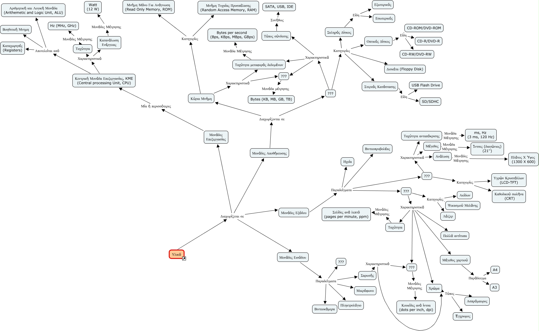 This Concept Map, created with IHMC CmapTools, has information related to: hardware, Κεντρική Μονάδα Επεξεργασίας, KME (Central processing Unit, CPU) Αποτελείται από Καταχωρητές (Registers), Ανάλυση Μονάδες Μέτρησης Πλάτος Χ Ύψος (1300 X 600), Κύρια Μνήμη Κατηγορίες Μνήμη Τυχαίας Προσπέλασης (Random Access Memory, RAM), Κύρια Μνήμη Χαρακτηριστικά ???, Σαρωτής Χαρακτηριστικά Χρώμα, Στερεάς Κατάστασης Είδη SD/SDHC, Ταχύτητα μεταφοράς δεδομένων Μονάδα Μέτρησης Bytes per second (Bps, KBps, MBps, GBps), Ταχύτητα Μονάδες Μέτρησης Hz (MHz, GHz), Μονάδες Επεξεργασίας Μία ή περισσότερες Κεντρική Μονάδα Επεξεργασίας, KME (Central processing Unit, CPU), ??? Μονάδα μέτρησης Bytes (KB, MB, GB, TB), Υλικό Διαχωρίζεται σε Μονάδες Εισόδου, ??? Χαρακτηριστικά Πολλά αντίτυπα, Στερεάς Κατάστασης Είδη USB Flash Drive, Τύπος σύνδεσης Συνήθως SATA, USB, IDE, Υλικό Διαχωρίζεται σε Μονάδες Εξόδου, Χρώμα Τύπος Έγχρωμος, Μονάδες Αποθήκευσης Διαχωρίζονται σε ???, Ταχύτητα ανταπόκρισης Μονάδα Μέτρησης ms, Hz (3 ms, 120 Hz), Οπτικός Δίσκος Είδη CD-RW/DVD-RW, ??? Χαρακτηριστικά Μέγεθος