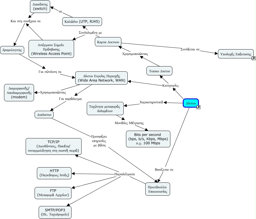 This Concept Map, created with IHMC CmapTools, has information related to: networks, Πρωτόκολλα Επικοινωνίας Παραδείγματα FTP (Μεταφορά Αρχείων), Καρτα Δικτυου Συνδεδεμένη με Ασύρματο Σημείο Πρόσβασης (Wireless Access Point), Διαδικτυο Προσφέρει υπηρεσίες με βάση Πρωτόκολλα Επικοινωνίας, Πρωτόκολλα Επικοινωνίας Παραδείγματα HTTP (Παγκόσμιος Ιστός), Δίκτυο Ευρείας Περιοχής (Wide Area Network, WAN) Χρησιμοποιώντας Διαμορφωτής/ Αποδιαμορφωτής (modem), Καρτα Δικτυου Συνδέεται σε Υποδοχές Επέκτασης, Δίκτυο Κατηγορίες Τοπικο Δικτυο, δρομολογιτης Για σύνδεση σε Δίκτυο Ευρείας Περιοχής (Wide Area Network, WAN), Καρτα Δικτυου Συνδεδεμένη με Καλώδιο (UTP, RJ45), Πρωτόκολλα Επικοινωνίας Παραδείγματα TCP/IP (Διευθύνσεις, Πακέτα/ συναρμολόγηση στη σωστή σειρά), Δίκτυο Βασίζεται σε Πρωτόκολλα Επικοινωνίας, Δίκτυο Ευρείας Περιοχής (Wide Area Network, WAN) Για παράδειγμα Διαδικτυο, Ταχύτητα μεταφοράς δεδομένων Μονάδες Μέτρησης Bits per second (bps, b/s, Kbps, Mbps) π.χ. 100 Mbps, Καλώδιο (UTP, RJ45) σε Διακόπτης (switch), Διακόπτης (switch) Και στη συνέχεια σε δρομολογιτης, Ασύρματο Σημείο Πρόσβασης (Wireless Access Point) Και στη συνέχεια σε δρομολογιτης, Πρωτόκολλα Επικοινωνίας Παραδείγματα SMTP/POP3 (Ηλ. Ταχυδρομείο), Δίκτυο Χαρακτηριστικά Ταχύτητα μεταφοράς δεδομένων, Τοπικο Δικτυο Χρησιμοποιώντας Καρτα Δικτυου, Δίκτυο Κατηγορίες Δίκτυο Ευρείας Περιοχής (Wide Area Network, WAN)