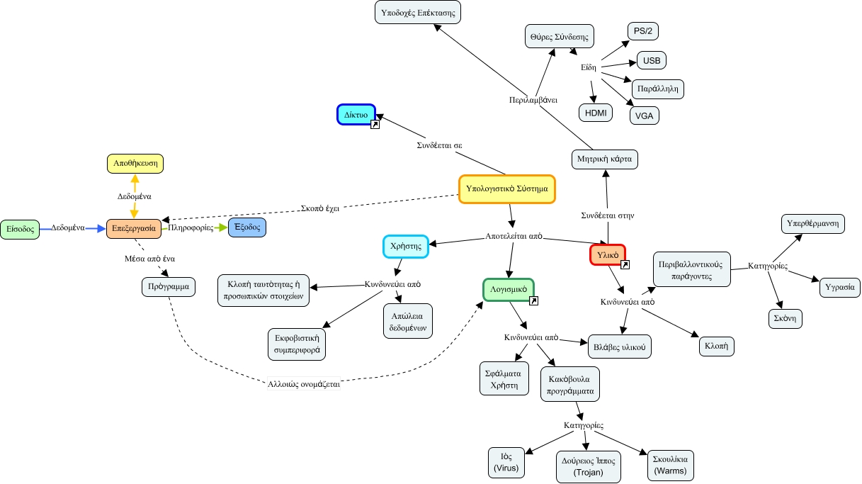 This Concept Map, created with IHMC CmapTools, has information related to: main, Υπολογιστικό Σύστημα Αποτελείται από Υλικό, Χρήστης Κυνδυνεύει από Απώλεια δεδομένων, Υπολογιστικό Σύστημα Σκοπό έχει Επεξεργασία, Χρήστης Κυνδυνεύει από Κλοπή ταυτότητας ή προσωπικών στοιχείων, Επεξεργασία Μέσα από ένα Πρόγραμμα, Χρήστης Κυνδυνεύει από Εκφοβιστική συμπεριφορά, Περιβαλλοντικούς παράγοντες Κατηγορίες Υπερθέρμανση, Υλικό Κινδυνεύει από Περιβαλλοντικούς παράγοντες, Μητρική κάρτα Περιλαμβάνει Θύρες Σύνδεσης, Λογισμικό Κινδυνεύει από Σφάλματα Χρήστη, Θύρες Σύνδεσης Είδη HDMI, Υλικό Κινδυνεύει από Κλοπή, Υπολογιστικό Σύστημα Συνδέεται σε Δίκτυο, Κακόβουλα προγράμματα Κατηγορίες Δούρειος Ίππος (Trojan), Περιβαλλοντικούς παράγοντες Κατηγορίες Υγρασία, Κακόβουλα προγράμματα Κατηγορίες Σκουλίκια (Warms), Λογισμικό Κινδυνεύει από Βλάβες υλικού, Επεξεργασία Πληροφορίες Έξοδος, Κακόβουλα προγράμματα Κατηγορίες Ιός (Virus), Υπολογιστικό Σύστημα Αποτελείται από Λογισμικό
