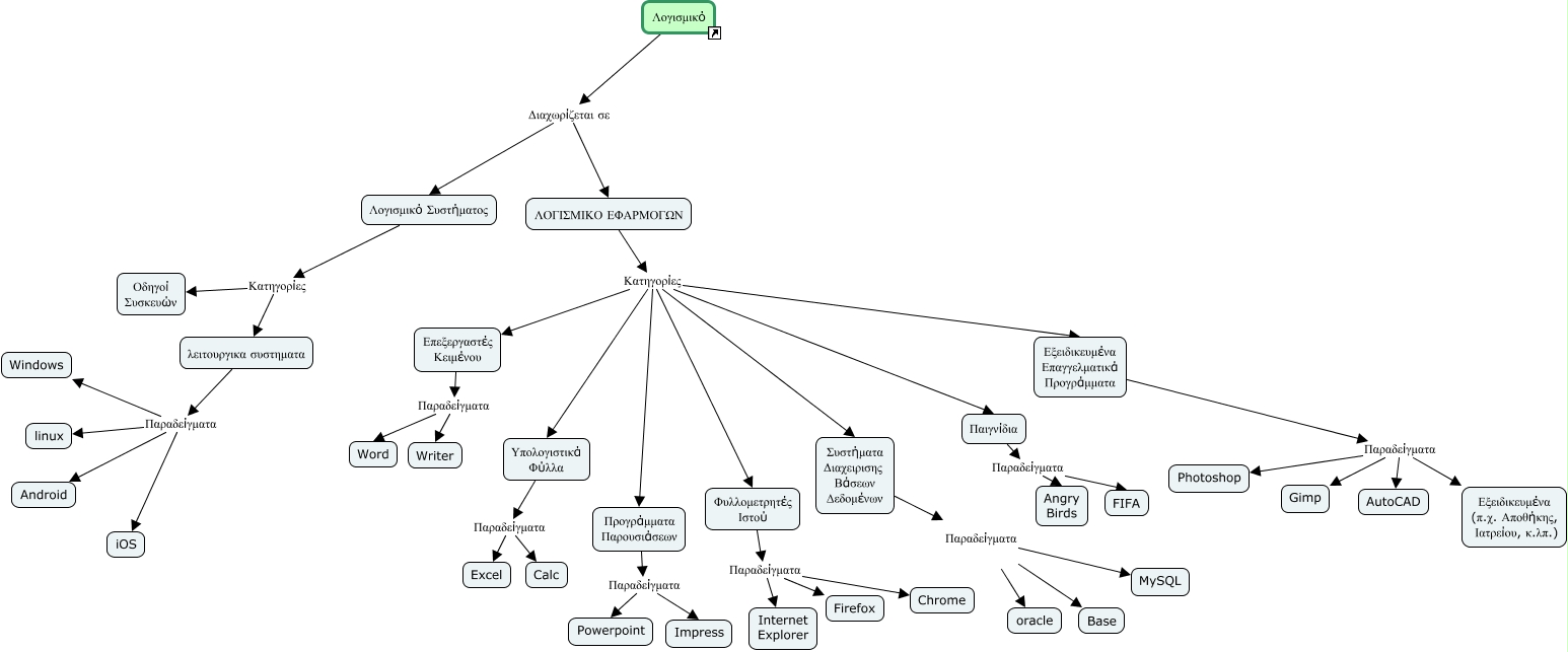 This Concept Map, created with IHMC CmapTools, has information related to: software, Υπολογιστικά Φύλλα Παραδείγματα Excel, Συστήματα Διαχειρισης Βάσεων Δεδομένων Παραδείγματα Base, Φυλλομετρητές Ιστού Παραδείγματα Chrome, λειτουργικα συστηματα Παραδείγματα iOS, ΛΟΓΙΣΜΙΚΟ ΕΦΑΡΜΟΓΩΝ Κατηγορίες Υπολογιστικά Φύλλα, ΛΟΓΙΣΜΙΚΟ ΕΦΑΡΜΟΓΩΝ Κατηγορίες Εξειδικευμένα Επαγγελματικά Προγράμματα, Λογισμικό Συστήματος Κατηγορίες Οδηγοί Συσκευών, ΛΟΓΙΣΜΙΚΟ ΕΦΑΡΜΟΓΩΝ Κατηγορίες Παιγνίδια, Επεξεργαστές Κειμένου Παραδείγματα Writer, ΛΟΓΙΣΜΙΚΟ ΕΦΑΡΜΟΓΩΝ Κατηγορίες Φυλλομετρητές Ιστού, Φυλλομετρητές Ιστού Παραδείγματα Firefox, Επεξεργαστές Κειμένου Παραδείγματα Word, λειτουργικα συστηματα Παραδείγματα Windows, Παιγνίδια Παραδείγματα Angry Birds, ΛΟΓΙΣΜΙΚΟ ΕΦΑΡΜΟΓΩΝ Κατηγορίες Συστήματα Διαχειρισης Βάσεων Δεδομένων, Συστήματα Διαχειρισης Βάσεων Δεδομένων Παραδείγματα MySQL, Λογισμικό Συστήματος Κατηγορίες λειτουργικα συστηματα, Εξειδικευμένα Επαγγελματικά Προγράμματα Παραδείγματα Εξειδικευμένα (π.χ. Αποθήκης, Ιατρείου, κ.λπ.), Εξειδικευμένα Επαγγελματικά Προγράμματα Παραδείγματα Photoshop, λειτουργικα συστηματα Παραδείγματα linux
