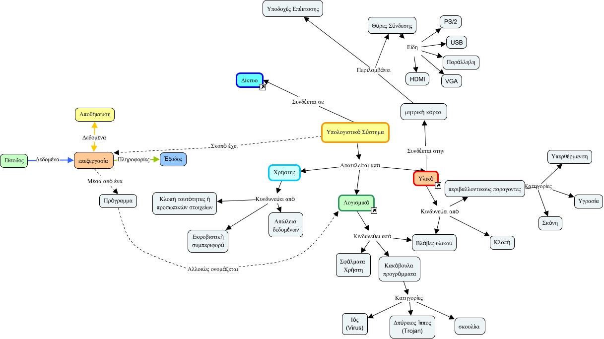 This Concept Map, created with IHMC CmapTools, has information related to: main, Υπολογιστικό Σύστημα Αποτελείται από Υλικό, Χρήστης Κυνδυνεύει από Απώλεια δεδομένων, Υπολογιστικό Σύστημα Σκοπό έχει επεξεργασία, Χρήστης Κυνδυνεύει από Κλοπή ταυτότητας ή προσωπικών στοιχείων, επεξεργασία Μέσα από ένα Πρόγραμμα, Χρήστης Κυνδυνεύει από Εκφοβιστική συμπεριφορά, περιβαλλοντικους παραγοντες Κατηγορίες Υπερθέρμανση, Υλικό Κινδυνεύει από περιβαλλοντικους παραγοντες, μητρική κάρτα Περιλαμβάνει Θύρες Σύνδεσης, Λογισμικό Κινδυνεύει από Σφάλματα Χρήστη, Θύρες Σύνδεσης Είδη HDMI, Υλικό Κινδυνεύει από Κλοπή, Υπολογιστικό Σύστημα Συνδέεται σε Δίκτυο, Κακόβουλα προγράμματα Κατηγορίες Δπύρειος Ίππος (Trojan), περιβαλλοντικους παραγοντες Κατηγορίες Υγρασία, Κακόβουλα προγράμματα Κατηγορίες σκουλίκι, Λογισμικό Κινδυνεύει από Βλάβες υλικού, επεξεργασία Πληροφορίες Έξοδος, Κακόβουλα προγράμματα Κατηγορίες Ιός (Virus), Υπολογιστικό Σύστημα Αποτελείται από Λογισμικό