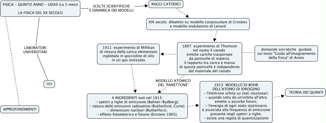 Questa Cmap, creata con IHMC CmapTools, contiene informazioni relative a: UDA9-FISICA-QUINTO-ANNO, 1897: esperimento di Thomson nel vuoto il catodo emette cariche trasportate da particelle di materia; il rapporto tra carica e massa di queste particelle è indipendente dal materiale del catodo ???? domande socratiche guidate sul testo "Guida all'insegnamento della fisica" di Arons, XIX secolo: dibattito su modello corpuscolare di Crookes e modello ondulatorio di Lenard ???? 1897: esperimento di Thomson nel vuoto il catodo emette cariche trasportate da particelle di materia; il rapporto tra carica e massa di queste particelle è indipendente dal materiale del catodo, FISICA - QUINTO ANNO - UDA9 (ca 5 mesi) LA FISICA DEL XX SECOLO ???? APPROFONDIMENTI, 1911: esperimento di Millikan di misura della carica elementare inglobata in goccioline di olio in un gas ionizzato ???? 4 INGREDIENTI noti nel 1913: - spettri a righe di emissione (Balmer-Rydberg); - natura delle emissioni radioattive (Rutherford, Curie); - dimensioni nucleari (Rutherfors); - effetto fotoelettrico e fotone (Einstein 1905)., RAGGI CATODICI SS XIX secolo: dibattito su modello corpuscolare di Crookes e modello ondulatorio di Lenard, 1897: esperimento di Thomson nel vuoto il catodo emette cariche trasportate da particelle di materia; il rapporto tra carica e massa di queste particelle è indipendente dal materiale del catodo MODELLO ATOMICO DEL 'PANETTONE' 4 INGREDIENTI noti nel 1913: - spettri a righe di emissione (Balmer-Rydberg); - natura delle emissioni radioattive (Rutherford, Curie); - dimensioni nucleari (Rutherfors); - effetto fotoelettrico e fotone (Einstein 1905)., FISICA - QUINTO ANNO - UDA9 (ca 5 mesi) LA FISICA DEL XX SECOLO SCELTE SCIENTIFICHE E DINAMICA DEI MODELLI RAGGI CATODICI, FISICA - QUINTO ANNO - UDA9 (ca 5 mesi) LA FISICA DEL XX SECOLO LABORATORI UNIVERSITARI ????, 1897: esperimento di Thomson nel vuoto il catodo emette cariche trasportate da particelle di materia; il rapporto tra carica e massa di queste particelle è indipendente dal materiale del catodo ???? 1911: esperimento di Millikan di misura della carica elementare inglobata in goccioline di olio in un gas ionizzato, 4 INGREDIENTI noti nel 1913: - spettri a righe di emissione (Balmer-Rydberg); - natura delle emissioni radioattive (Rutherford, Curie); - dimensioni nucleari (Rutherfors); - effetto fotoelettrico e fotone (Einstein 1905). ???? 1913: MODELLO DI BOHR DELL'ATOMO DI IDROGENO - l'elettrone orbita su stati stazionari; - quando salta da un'orbita all'altra emette o assorbe fotoni; - l'energia di ogni stato stazionario è associata alla frequenza di emissione presente negli spettri a righe; - esiste una regola di quantizzazione, 1913: MODELLO DI BOHR DELL'ATOMO DI IDROGENO - l'elettrone orbita su stati stazionari; - quando salta da un'orbita all'altra emette o assorbe fotoni; - l'energia di ogni stato stazionario è associata alla frequenza di emissione presente negli spettri a righe; - esiste una regola di quantizzazione ???? TEORIA DEI QUANTI