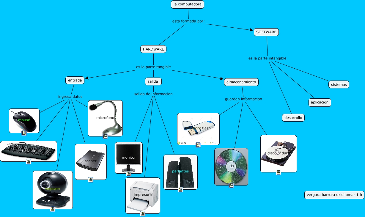 Este Cmap, tiene información relacionada con: uziel, SOFTWARE es la parte intangible desarrollo, entrada ingresa datos scaner, SOFTWARE es la parte intangible sistemas, entrada ingresa datos mouse, HARDWARE es la parte tangible salida, HARDWARE es la parte tangible almacenamiento, almacenamiento guardan informacion CD, la computadora esta formada por: SOFTWARE, almacenamiento guardan informacion memory flash, salida salida de informacion parlantes, salida salida de informacion monitor, salida salida de informacion impresora, almacenamiento guardan informacion disco duro, SOFTWARE es la parte intangible aplicacion, la computadora esta formada por: HARDWARE, HARDWARE es la parte tangible entrada, entrada ingresa datos teclado, entrada ingresa datos wepcam, entrada ingresa datos microfono