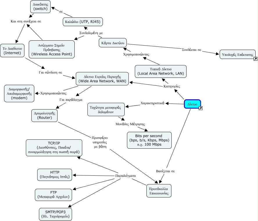 This Concept Map, created with IHMC CmapTools, has information related to: networks, Πρωτόκολλα Επικοινωνίας Παραδείγματα FTP (Μεταφορά Αρχείων), Κάρτα Δικτύου Συνδεδεμένη με Ασύρματο Σημείο Πρόσβασης (Wireless Access Point), Δρομολογητής (Router) Προσφέρει υπηρεσίες με βάση Πρωτόκολλα Επικοινωνίας, Πρωτόκολλα Επικοινωνίας Παραδείγματα HTTP (Παγκόσμιος Ιστός), Δίκτυο Ευρείας Περιοχής (Wide Area Network, WAN) Χρησιμοποιώντας Διαμορφωτής/ Αποδιαμορφωτής (modem), Κάρτα Δικτύου Συνδέεται σε Υποδοχές Επέκτασης, Δίκτυο Κατηγορίες Τοπικό Δίκτυο (Local Area Network, LAN), Το Διαδίκτυο (Internet) Για σύνδεση σε Δίκτυο Ευρείας Περιοχής (Wide Area Network, WAN), Κάρτα Δικτύου Συνδεδεμένη με Καλώδιο (UTP, RJ45), Πρωτόκολλα Επικοινωνίας Παραδείγματα TCP/IP (Διευθύνσεις, Πακέτα/ συναρμολόγηση στη σωστή σειρά), Δίκτυο Βασίζεται σε Πρωτόκολλα Επικοινωνίας, Δίκτυο Ευρείας Περιοχής (Wide Area Network, WAN) Για παράδειγμα Δρομολογητής (Router), Ταχύτητα μεταφοράς δεδομένων Μονάδες Μέτρησης Bits per second (bps, b/s, Kbps, Mbps) π.χ. 100 Mbps, Καλώδιο (UTP, RJ45) σε Διακόπτης (switch), Διακόπτης (switch) Και στη συνέχεια σε Το Διαδίκτυο (Internet), Ασύρματο Σημείο Πρόσβασης (Wireless Access Point) Και στη συνέχεια σε Το Διαδίκτυο (Internet), Πρωτόκολλα Επικοινωνίας Παραδείγματα SMTP/POP3 (Ηλ. Ταχυδρομείο), Δίκτυο Χαρακτηριστικά Ταχύτητα μεταφοράς δεδομένων, Τοπικό Δίκτυο (Local Area Network, LAN) Χρησιμοποιώντας Κάρτα Δικτύου, Δίκτυο Κατηγορίες Δίκτυο Ευρείας Περιοχής (Wide Area Network, WAN)