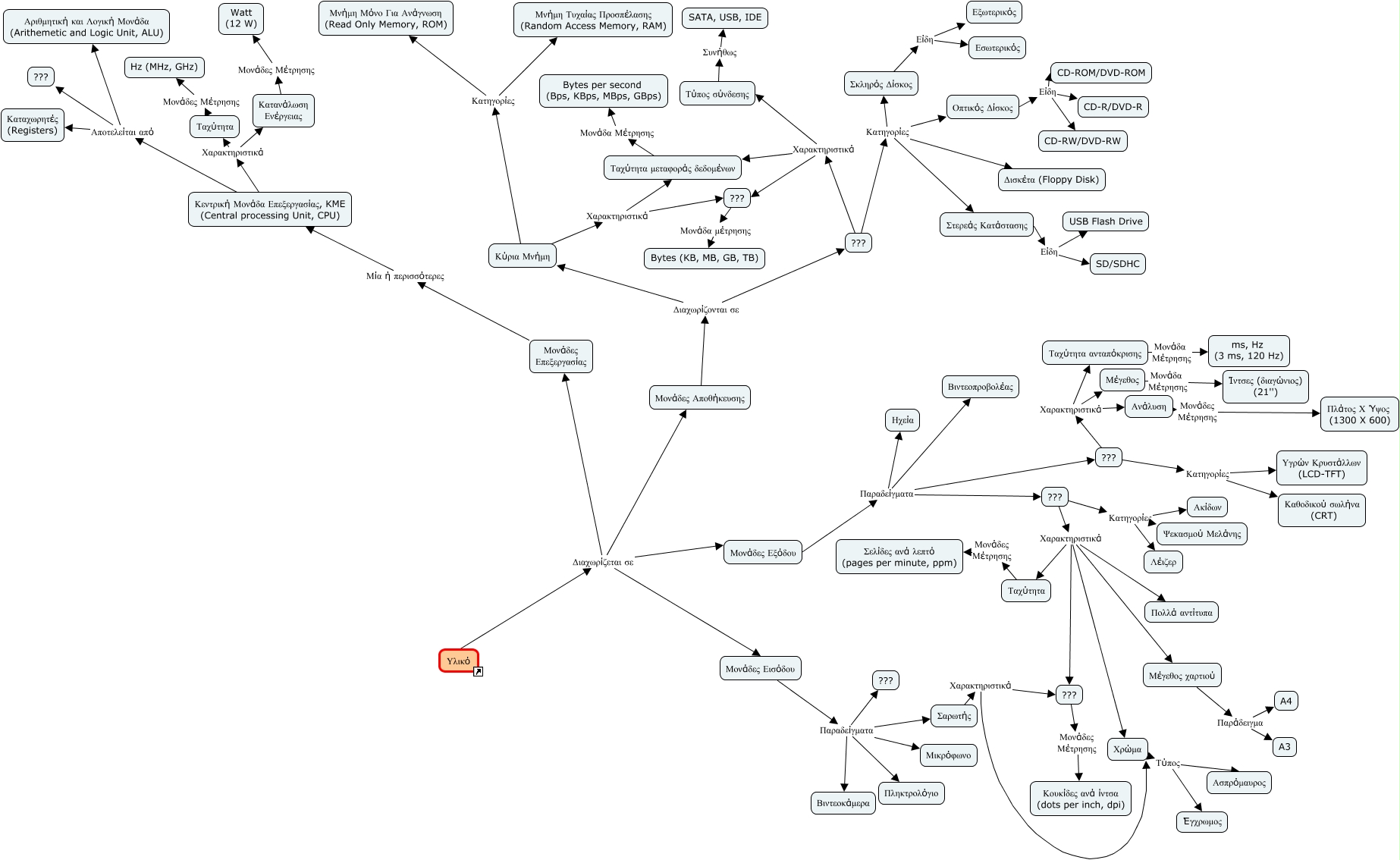 This Concept Map, created with IHMC CmapTools, has information related to: hardware, �?ατανάλωση Ενέ�?γειας �?ονάδες �?έτ�?ησης Watt (12 W), �?ονάδες Εξ�?δου Πα�?αδείγματα ???, �?εντ�?ική �?ονάδα Επεξε�?γασίας, KME (Central processing Unit, CPU) Αποτελείται απ�? ???, Υλικ�? Διαχω�?ίζεται σε �?ονάδες Εξ�?δου, ??? �?ατηγο�?ίες Σκλη�?�?ς Δίσκος, Σα�?ωτής Χα�?ακτη�?ιστικά Χ�?�?μα, �?ονάδες Εισ�?δου Πα�?αδείγματα Βιντεοκάμε�?α, Ανάλυση �?ονάδες �?έτ�?ησης Πλάτος Χ �?�?ος (1300 X 600), �?έγεθος χα�?τιο�? Πα�?άδειγμα A3, �?έγεθος χα�?τιο�? Πα�?άδειγμα A4, �?ονάδες Εισ�?δου Πα�?αδείγματα Σα�?ωτής, �?εντ�?ική �?ονάδα Επεξε�?γασίας, KME (Central processing Unit, CPU) Αποτελείται απ�? Α�?ιθμητική και Λογική �?ονάδα (Arithemetic and Logic Unit, ALU), Υλικ�? Διαχω�?ίζεται σε �?ονάδες Επεξε�?γασίας, Υλικ�? Διαχω�?ίζεται σε �?ονάδες Αποθήκευσης, �?ονάδες Εισ�?δου Πα�?αδείγματα �?ικ�?�?φωνο, Ταχ�?τητα ανταπ�?κ�?ισης �?ονάδα �?έτ�?ησης ms, Hz (3 ms, 120 Hz), ??? �?ονάδα μέτ�?ησης Bytes (KB, MB, GB, TB), �?έγεθος �?ονάδα �?έτ�?ησης �?ντσες (διαγ�?νιος) (21''), ??? �?ατηγο�?ίες �?αθοδικο�? σωλήνα (CRT), ??? Χα�?ακτη�?ιστικά Ταχ�?τητα μεταφο�?άς δεδομένων